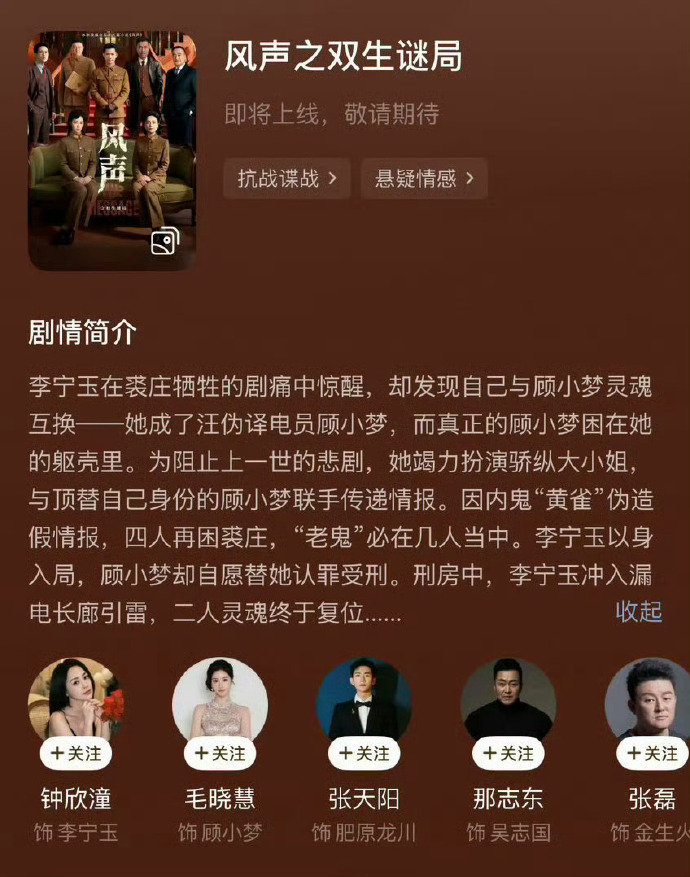 风声短剧阵容阿娇毛晓慧首演短剧 短剧《风声》官宣!阿娇毛晓慧首演短剧即挑战谍战双女主,加上张天阳、张磊、王建新等实力派长剧演员,全员演技在线,反转不断,竖短诚意之作!