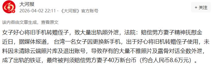 冤不冤!台湾一名女子因更换新手机,出于好心将旧机转赠侄子使用,未料因未清除云端照片库及退出账号,导致存有的大量不雅照片及露骨对话全数外泄, 成了出轨的铁证,最终被判须赔偿男方妻子40万新台币(约合人民币8.6万元)。 台湾一则判决结果引发热议,一名女子只因好心将旧手机转赠侄子,最终被判赔偿他人8.6万元人民币。没人能想到,这份看似善意的举动,竟意外曝光了自己的秘密,还牵扯出一场赔偿纠纷。 事情的起因,是女子更换了一部新手机。家里的旧手机还能正常使用,扔了可惜,女子想到正在上学的侄子刚好需要一部手机,便决定将旧手机赠送给侄子,既不浪费,也能帮衬一下侄子。 女子收拾旧手机时,只是简单删除了表面的照片和信息,觉得这样就足够安全,完全没意识到隐患。她没有退出手机绑定的云端账号,也没有彻底清除云端照片库,便匆匆将手机交给了侄子。 侄子拿到手机后,很快就开始使用。一次无意间,他点开手机相册,发现里面不仅有女子的日常照片,还有大量不雅照片,以及许多露骨的聊天对话,内容不堪入目,一看就不是正常的社交往来。 这些照片和对话,都是女子和他人出轨留下的痕迹,原本被她存在云端,以为删除本地记录就万事大吉,却忘了账号还在登录状态,云端内容会自动同步到手机上。侄子的发现,让这场秘密彻底败露。 消息很快传开,最终传到了被出轨男子的妻子耳中。得知丈夫出轨的真相,看到那些不堪入目的照片和对话,她深受打击,内心的痛苦难以平复,最终决定通过法律途径,向女子讨回公道。 她正式向法院提起诉讼,要求女子赔偿自己的精神损失。女子得知后十分慌乱,辩称是侄子未经同意查看自己的相册,侵犯了自己的隐私权,不应该承担赔偿责任。 法院审理过程中,明确指出女子是主动将手机赠送给侄子使用,交付前既未彻底删除私密内容,也未退出云端账号、设置防护密码,理应预见接收者会接触到手机内的内容。 法院认定,女子的行为已经严重破坏了男方妻子的配偶权,给对方造成了巨大的精神伤害,其辩解无法成立。结合双方身份、经济能力等因素,最终做出判决。 判决结果显示,女子需赔偿男方妻子40万新台币,按照当前汇率换算,约合人民币8.6万元,这笔费用全部作为男方妻子的精神抚慰金,弥补她所遭受的心理创伤。 据悉,如今很多人更换旧电子产品时,仅会简单删除内容或恢复出厂设置,却不知这样无法彻底清除数据,依靠技术手段仍能恢复,极易引发隐私泄露问题。 相关专业人员表示,处置旧手机时,必须彻底退出所有绑定账号,对数据进行物理级清除,才能避免隐私泄露,否则可能面临隐私曝光甚至法律风险。 一场好心的馈赠,最终变成了一场赔偿纠纷,女子不仅泄露了自己的隐私,还付出了沉重的经济代价,也给多个家庭带来了无法挽回的伤害。 目前,该判决已生效,女子需按时支付赔偿款项,全案仍有上诉的可能,后续相关进展还需等待进一步通知。 对此,你们有什么看法,欢迎评论留言~