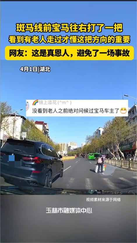 “怪不得能开宝马!”4月1日,湖北,一司机驾车正常行驶在路上,快到斑马线时,旁边车道的一辆宝马车,突然打方向别他,司机见状赶紧急刹车,刚刹住车呢,就看见前面斑马线上走过来一个老人。网友:没看到老人前绝对问候过了! 遇到一个别车的,不少司机得恨得牙痒痒,有些路怒的恨不能全家都给问候一遍。这个行为在路上十分危险,尤其是车速快的情况下,很可能刹不住车发生事故。但有时候,别车也可能是出于善意。 据媒体报道,当日,该车正行驶在中间车道上,左边车道有一辆宝马车。路上的车也不多,双方开的速度都不慢。这时候,左边那辆宝马车突然开始减速,向右别了过来。 司机见状,赶紧刹车避让,快要撞上了才刹停。这时候,他才发现,前面是斑马线。就在他刚刹停车的时候,左边宝马车的前面走出来一位老太,身上背着包,手里提着一大堆东西,走的速度也不快。 他这才明白,宝马车这是冒着被撞的风险,救了自己一命。他不别这一下,自己开过去的时候,怕是正好就撞上老人了。等到老人顺利走到路边,宝马车就直接开走了。 网友看后表示,这真是遇到好人了,自己担风险,救了两个人,这格局,这魄力,要不然人家怎么能开宝马呢! 信息来源:《斑马线前宝马往右打了一把,看到有老人走过才懂这把方向的重要,网友:这是真恩人,避免了一场事故》玉林晚报