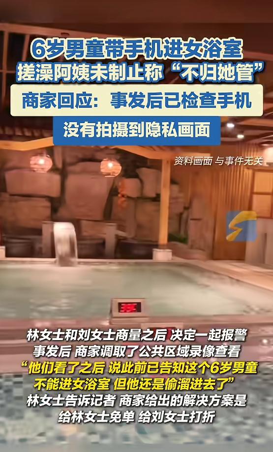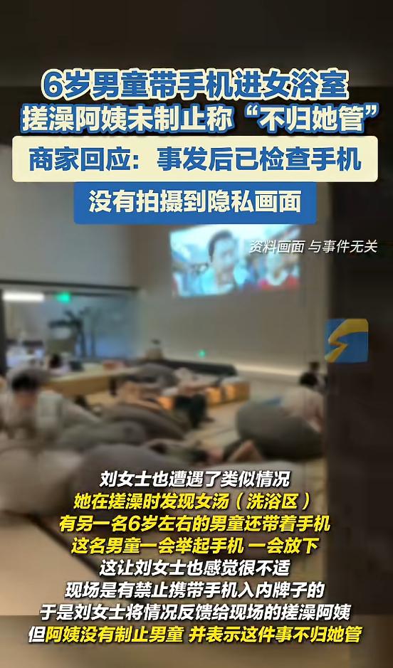 “太冒昧了!”4月2日,江苏南京,一女子在搓澡时,发现一名男童带着手机进来,并且男童一会举起手机一会放下,这让女子十分不适,怕男童在录像,于是将情况反映给现场搓澡阿姨,但阿姨并没有制止男童,还说这件事不归她管!网友:家长也不管吗?   4月2日,江苏南京,一位刘女士(化姓)去洗浴中心搓澡,本来想着好好放松一下,结果没一会儿就浑身不自在,起因是一个小男孩闯进了女浴室,手里还攥着一部手机。   据了解,这个男童大概6岁左右,进了女浴室后,手里的手机就没闲着,一会举起来对着周围晃,一会又放下,刘女士当时正在搓澡,浑身没有遮挡,看到这一幕心里瞬间发慌,生怕孩子是在偷偷录像。   换谁遇到这种事都会不舒服,刘女士赶紧把现场的搓澡阿姨喊过来,跟她说了男童带手机的情况,希望阿姨能制止一下,可没想到,搓澡阿姨看了一眼,随口就说了一句“这件事不归我管”,说完就转身继续干活,压根没理这个男童。   刘女士心里更膈应了,好好的搓澡心情全被破坏了,当天在同一个洗浴中心,还有一位林女士(化姓)也遇到了类似的事,她在更衣室换衣服时,看到有家长带着一男一女两个孩子进来。   其中的男童才2岁左右,林女士觉得不妥,赶紧转身退了出去,也正是这时,她遇到了同样满心委屈的刘女士。   两人一聊,越想越觉得不对劲,商量之后就报了警,事后,涉事商家也给出了回应,说已经检查过那个6岁男童的手机,确认没有拍摄到任何顾客的隐私画面,还说之前已经告知过男童不能进女浴室,是孩子自己偷溜进去的。   更让人无奈的是,商家对于男童能否进入女浴室的说法,还前后矛盾,一开始有工作人员说,女浴室不允许男童进入,但后来又改口,说身高90厘米以下的孩子可以进入。   而且有顾客发现,现场其实是有禁止携带手机入内的牌子,可根本没人去监督执行,这件事被曝光后,网友们也炸开了锅,最关心的就是“家长去哪了”。   说白了,不管孩子多大,女浴室都是私密场所,家长怎么能让男童随便进去,还带着手机?就算孩子不懂事,家长也该有基本的边界感,这不仅是尊重别人,也是对孩子的正确引导。   搓澡阿姨说“不归我管”,或许有自己的难处,没有直接管理的权限,但至少可以上报给店里的负责人,而不是直接不管不顾。商家的管理更是不到位,规定模糊不清,执行也流于形式,才会出现这样的问题。   虽然最后确认手机没有拍到隐私,算是虚惊一场,但这件事给很多人提了个醒。去公共场所尤其是洗浴这种私密地方,家长要看好自己的孩子,守住边界,商家也要完善管理,明确规定,做好监督,别让顾客再遇到这种膈应人的事。   毕竟,尊重别人的隐私,才是最基本的底线。
