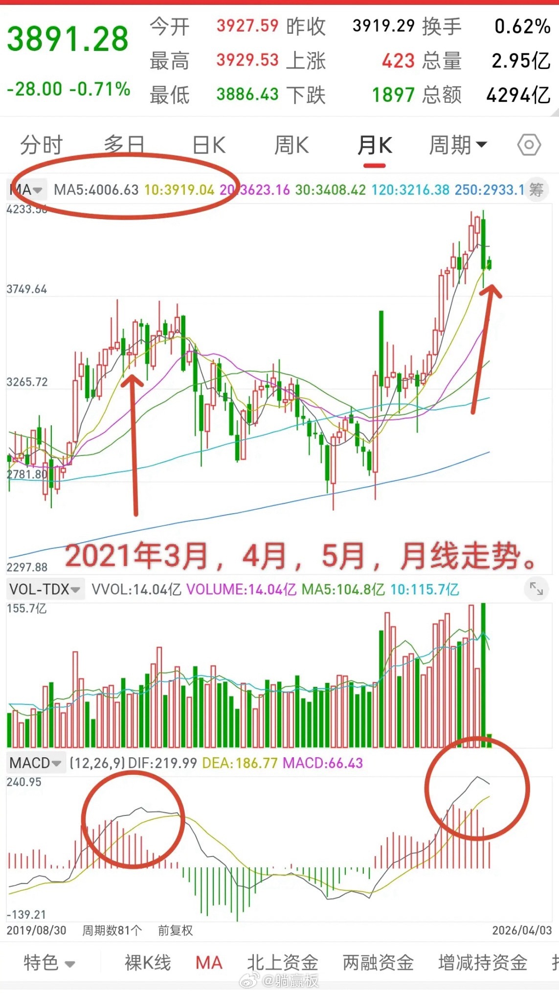因此,我说,3900附近是第一低吸位置,3850附近是第二低吸位置,4月份可以看到前顶4025平台。