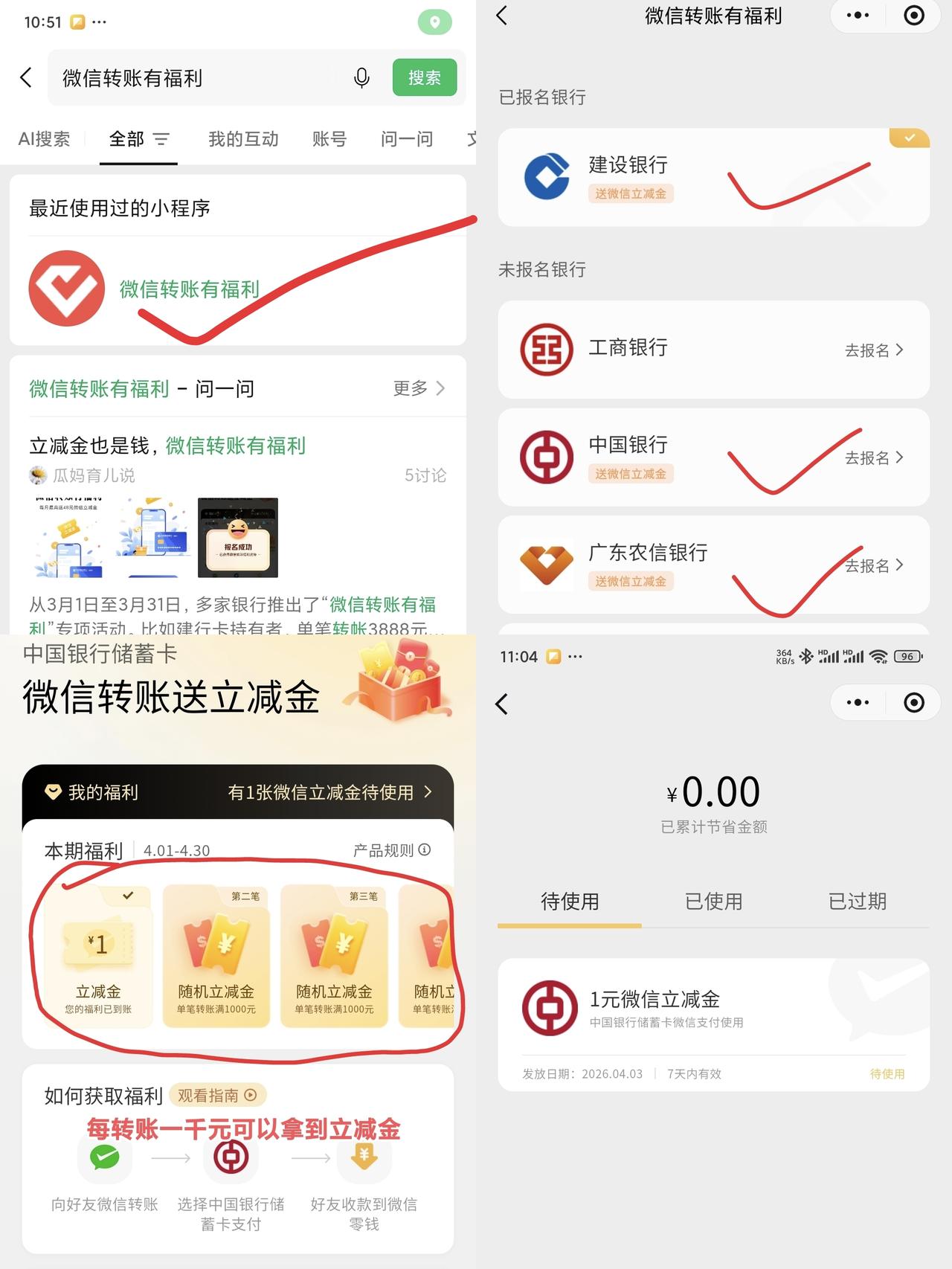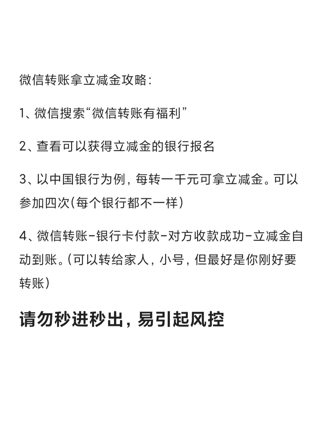 微信转账拿立减金攻略: 1、微信搜索“微信转账有福利” 2、查看可以获得立减金的银行报名 3、以中国银行为例,每转一千元可拿立减金。可以参加四次(每个银行都不一样) 4、微信转账-银行卡付款-对方收款成功-立减金自动到账。(可以转给家人,小号,但最好是你刚好要转账) 请勿秒进秒出,易引起风控!!! 免费薅羊毛 薅羊毛小分队