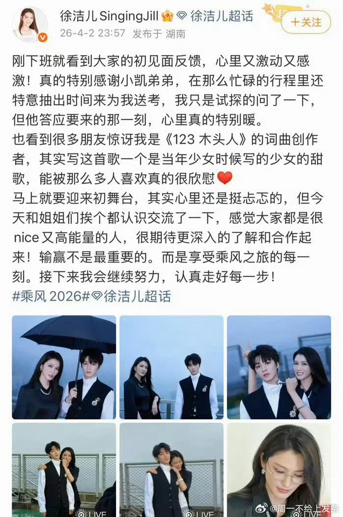 徐洁儿感谢小凯弟弟乘风2026徐洁儿深夜感谢王俊凯百忙之中专程担任送考人,二人因