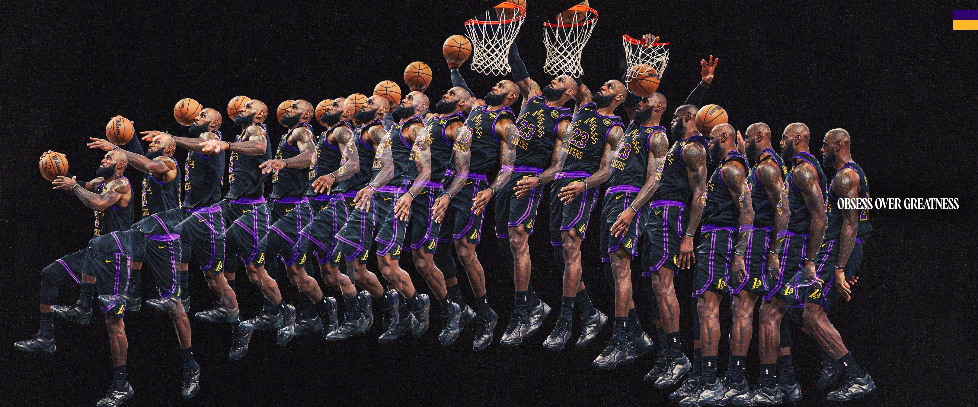 湖人官方晒出的一张詹姆斯扣篮瞬间特效图