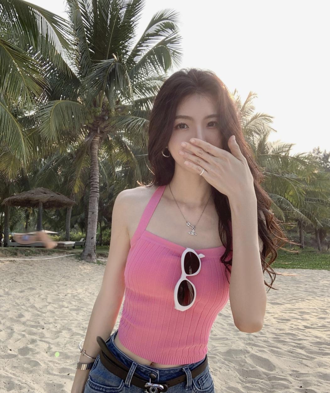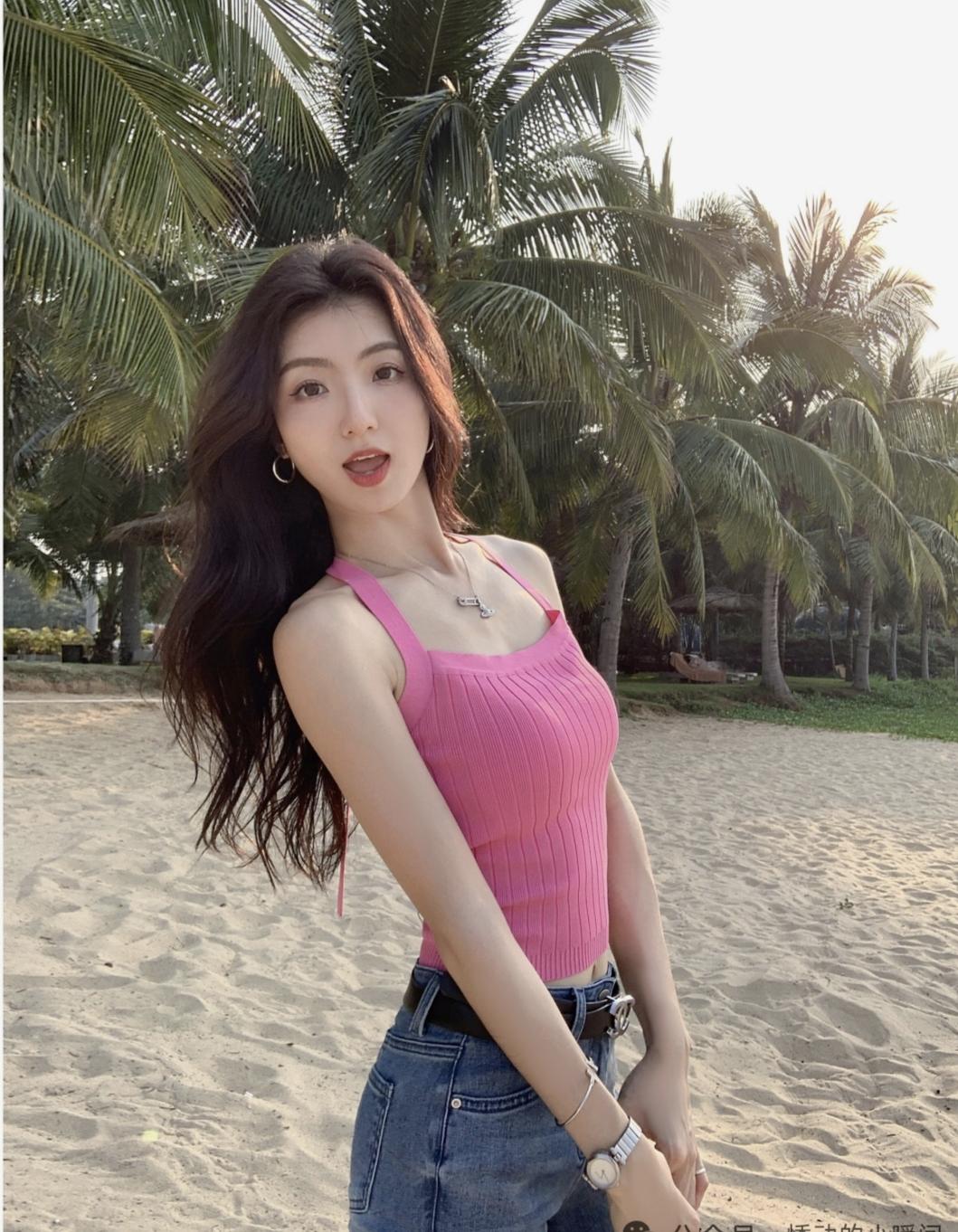 沙滩上的甜美自拍,粉色上衣配墨镜,度假氛围满满!🌴👙🕶️