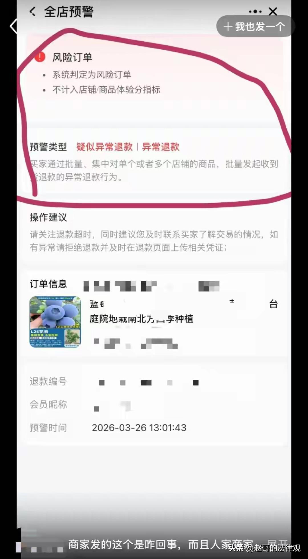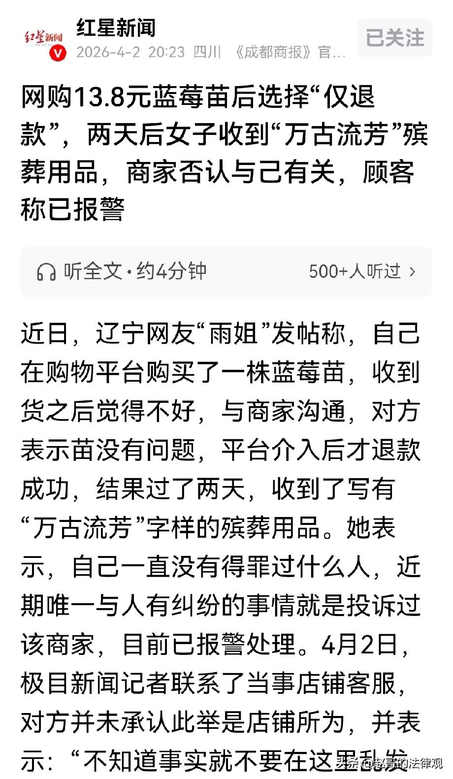 辽宁,女子在网上花13.8元买了棵蓝莓苗,到货后发现苗子不太好,要求退款被商家拒绝,直到平台介入,终于退款成功。不料,两天后,女子收到写有“万古流芳”字样的殡葬用品,她怀疑是商家报复,她找商家沟通,可后续商家的操作,气的女子直接报警。 雨姐那天刷视频,突然看到有卖蓝莓苗的,展示的蓝莓成熟后的苗木,非常吸引人。 蓝莓市场上价格一直非常昂贵,而一颗小小的蓝莓苗木,只需种到花盆就可以收获到满满的蓝莓果实。 而且蓝莓对眼睛非常友好,多吃蓝莓,可以说好处多多。 鱼姐当然认为,种一颗蓝莓苗要比买蓝莓合适的多。 而且一颗苗子,从小到大可以陪伴它成长,直到收获到果实满满的都是成就感。 于是,她当场就下单了两棵苗,一棵蓝莓一棵柠檬。 商家发货很快,苗木到后,她打开包装,可看来看去,就觉得蓝莓苗的状态不对劲。 叶子蔫巴巴的不精神,担心这样的苗子养不活,找卖家说了情况。 意思是,想退掉这棵不好的蓝莓苗,只留下那颗柠檬苗。 可卖家那边根本不认可她的说法,且态度强硬,说苗子没毛病。 雨姐不想纠缠,就想自己吃点亏,把那棵蓝莓苗退回去。 她在平台上点了退货退款,自己承担运费,还约了快递上门取件。 可卖家这时突然改变了态度。 对方发消息过来,让她不要折腾退货了,直接把蓝莓苗折断毁掉,拍张照片发给他们。 卖家那边给仅退款,钱退给她,苗你也不用寄回去了。 雨姐觉得这样也行,省事。她就把苗折断拍了照发过去,等着退款到账。 结果这一等就没了音讯,第一天没动静,第二天她又去催,卖家那边消息也不回,跟人间蒸发了一样。 无奈之下,她只好找平台客服,平台介入之后,3月28号那笔13.8元才退回到她账户上。 钱退回之后,被消费体验影响了的糟糕心情也随之而散,她以为这事翻篇了。 没想到,两天后一个快递小哥送来个包裹。 她拆开一看,差点没气背过去,里面摆着殡葬用的东西,白底黑字写着“万古流芳”,这摆明了是咒人! 她翻来覆去地回忆,自己没跟谁结过仇,网上也没跟人吵过架。 唯一闹过不愉快的,就是这家卖苗木的店家。 她马上联系卖家,对方一口咬定不是自己干的,语气还很不友好。 雨姐忍不下这口气,就为了10几块钱,在清明前这样恶搞,雨姐忍不下这口气,她报了警。 民警查了一下寄件信息,发现寄这个包裹的人,本身就是一个专门卖殡葬用品的商家。 至于这个商家跟卖苗的卖家有没有关系,警方说还在查,让她等通知。 这事在网上发布后,有人贴出一张截图。 截图显示,卖家在后台给雨姐那笔订单打了个标签,写着风险订单,疑似异常退款。 这个标签一出来,底下就有人评论,问雨姐是不是想白嫖。 雨姐又气又委屈,一棵蓝莓苗才13块8,她当初是自己主动要退货、自己出运费寄回去的。 是卖家自己提出来让她把苗折断、仅退款的,她从头到尾没主动要过什么好处。 她还专门问了平台客服。客服告诉她,“风险订单”的标签,是商家自己在后台标的,不是系统自动打的。 可卖家却说是系统判定的,两边说法对不上。 雨姐联系了媒体,记者联系店家客服,对方接起来没说两句就挂了,再打就打不通了。 客服还斥责记者:不知道事实就别乱发信息。 雨姐现在,也只能怀疑是卖家干的,她放了一句话:如果不是你们寄的,我愿意公开道歉。 她不想冤枉好人,但这口气咽不下去,她就想把那个寄东西的人找出来。 有意思的是,那个卖家也报警了,两边都说自己是受害者,都等着警方给个说法。 平台却回复:那张“风险订单”的截图,确实是卖家自己动手标的。 谁在说谎,恐怕只有寄快递的那个人最清楚。 《治安管理处罚法》第42条规定:多次发送侮辱、恐吓或者其他信息,干扰他人正常生活的,处5日以下拘留或者500元以下罚款; 情节较重的,处5日以上10日以下拘留,可以并处500元以下罚款。 也就是说,如果有人通过发东西、发信息等方式,用侮辱、恐吓的内容打扰别人正常生活,就违反了这条法律,可能会被拘留或罚款。 本案中,女子收到的殡葬用品,若查实是商家因退款纠纷故意寄送。 这种行为带有侮辱、恐吓性质,干扰了女子的正常生活,商家可能要承担相应的法律责任。 有人说是女主白嫖,因为经常干这事,才被打上标签。 有人说是卖家的问题,诚信和服务才是商家的立身之本。 对此事,你怎么看? 关注@赵哥的法律观 ,欢迎评论区发表您的看法。