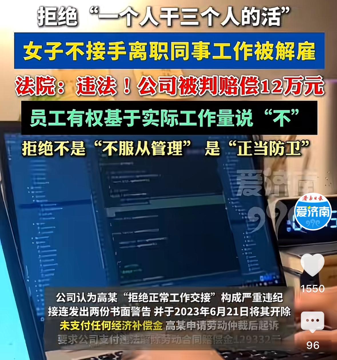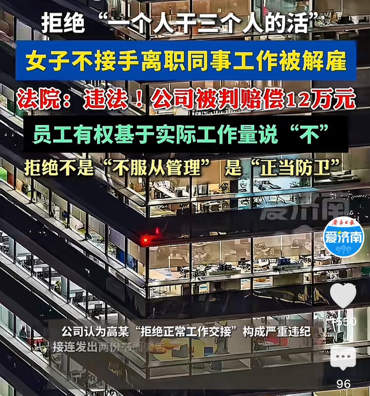 现代版周扒皮!北京一女子,公司先后要求她接管两名离职员工的工作,女子拒绝1个人干3个人的活。可公司却认为女子这是不服从工作安排,连续两次向她发送书面警告,最后将其辞退,并未支付任何经济补偿金。女子认为,拒绝不是不服从管理,而是维护自身的权益,故将公司诉至法院,法院的判决大快人心! 高某于2017年4月,任职于北京的一家食品公司,担任华北地区订单员。 工作期间,她兢兢业业,和所负责区域的18名销售人员相处的都很融洽。 期间,因其他区域的一名订单员离职,公司直接将该订单员的工作,以工作安排的名义,转交给了高某。 彼时,高某的工作量,从对接18名销售员,直接飙升至对接52名销售员,工作严重饱和。 她也没有怨言,而是继续她兢兢业业的工作风格。 然而,自从接手了该离职员工的工作,加班成了家常便饭。可为了生计,她还是一直咬牙坚持。 但是,让高某没想到的是,2023年3月,又有一名订单员离职,公司这次又想把这名离职员工的工作转交给她。 高某这次态度很明朗,坚决不接手。 她多次和公司沟通,她已经接管了一名离职员工的工作,工作量已经严重饱和,时不时的要加班,工作负荷已经超标,真的没有精力和时间,再接管其他离职人员的工作了,希望公司理解。 然而,高某的沟通和诉求并未得到公司重视,公司仍旧强行要求她接管这名离职员工的工作。 高某果断拒绝一个人干三个人的活。 结果,公司以拒绝正常工作交接为由,两次向高某发送书面警告,并于2023年6月21日将高某辞退,并未支付任何经济补偿。 高某称,她的行为根本不构成不服从工作安排,她这是正当防卫,正当维护作为一名劳动者的合法权益。 随后,高某申请劳动仲裁后起诉,要求公司支付违法解除劳动合同赔偿金129332元。 《劳动合同法》第31条、35规定:用人单位应当严格执行劳动定额标准,不得强迫或者变相强迫劳动者加班。 用人单位与劳动者协商一致,可以变更劳动合同约定的内容。 本案中,公司让高某接管一名离职员工的工作,她对接的18名销售员飙升至52名,工作量已经严重饱和。 而公司再次要求她,继续接管另一名离职员工的工作,已经明显严重的超出合理负荷,公司的行为属于变更劳动合同核心内容,且未经员工同意单方强压,此行为构成违法。 违法解除劳动合同,须按经济补偿标准的二倍(2N)支付赔偿金。 最终,北京中三院终审认定:公司安排超出合理负荷,属变相强迫加班,员工拒绝属正当维权,非对抗管理,故公司解除合同缺乏合理合法性,构成违法解除,最终判公司支付高某赔偿金12万余元。 本案中,高某的行为,属正当维权,是在维护自己作为劳动者的休息权、健康权、合同权利,并非对抗管理。 员工有服从义务,但只限于合理、公平的劳动安排。面对不合理加量、PUA式安排,有权拒绝。 另外,公司并未评估安排给高某的工作是否超负荷,而是直接以不服从交接辞退,本身就缺乏人性化管理。 这种管理方式,违背了以人为本的原则,不利于公司发展。 企业是有经营自主权,但不能侵犯劳动者健康权、休息权。 对此,你怎么看?