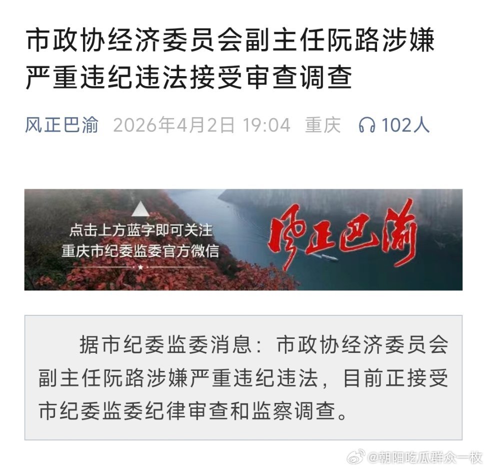 重庆市政协经济委员会副主任阮路涉嫌严重违纪违法接受审查调查。