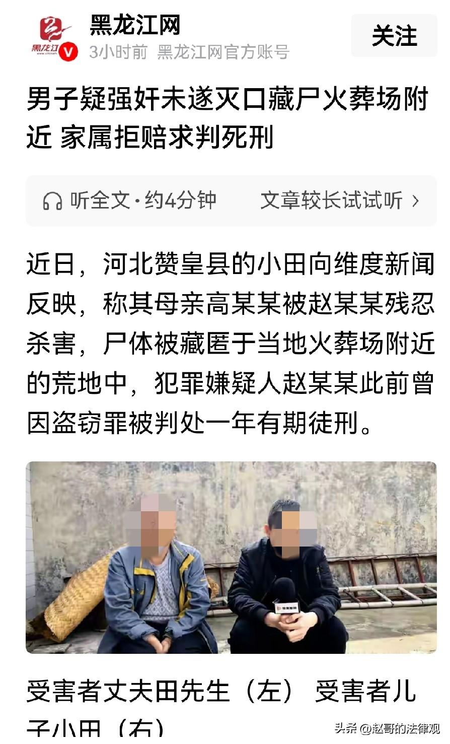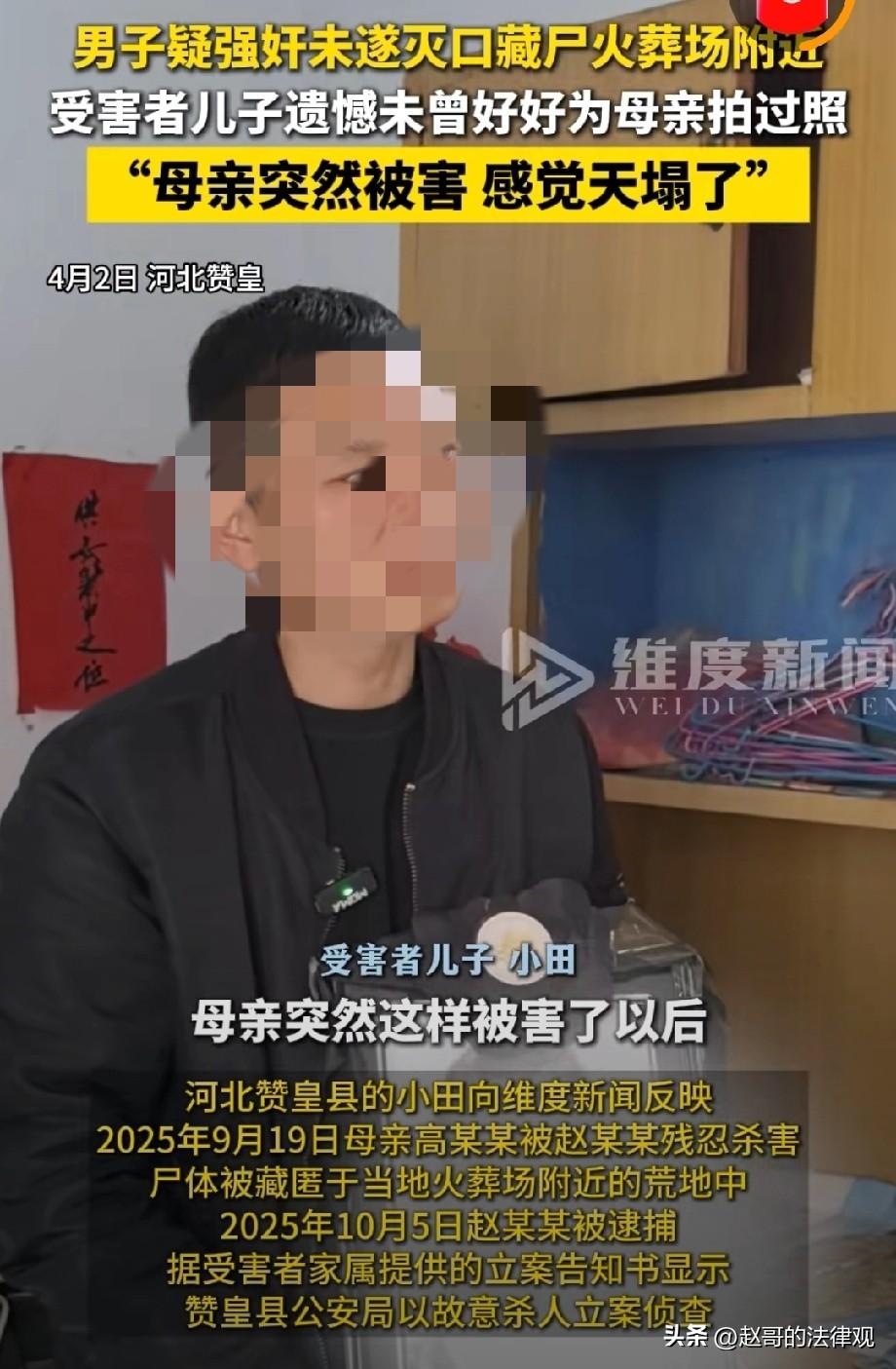 严惩!河北赞皇,一男子以送花生为由,将同村女子骗到自家花生地实施侵犯,遭到反抗后将女子残忍杀害,尸体就藏在当地火葬场附近的荒地中。更让人不寒而栗的是,男子作案后,照常在村里生活了半个月,还变卖了死者价值9000多元的首饰,使用她的手机下载各种付费软件。女子家人发现母亲微信异常后报警,得知真相的那一刻,他们只有一个诉求:不要一分钱赔偿,只求判凶手死刑! 高某的丈夫常年在外地打工,儿子小田在石家庄市区做点小买卖。 高某却一个人留在村里,因为需要跟大伯家,轮流照顾瘫痪在床的婆婆。 去年9月10号,是小田最后一次见到母亲。 因为那段时间店里比较忙,母亲那几天正好没事,他就打电话让母亲来给他帮了几天忙。 忙完以后,小田亲自把母亲送回了老家,可谁也没想到,这一面竟成了永别! 从那之后,小田跟母亲在微信上还有联系,几天以后,他慢慢觉得不对劲了。 他母亲不认识几个字,平时微信都是开视频或者语音,几乎没打过字。 可那段时间,他每次发消息过去,对方回的都是一段一段的文字。 而且只要他打电话过去,对方就挂掉,从来不接,他察觉这不是母亲的习惯。 而且,就连父亲的电话、视频母亲也不接。 小田心里开始发慌,他正想再联系母亲时,对方发来一段视频,说自己闺蜜生病了,在隔壁县的医院里,她得去照顾几天。 视频里确实有个医院的样子,但小田总觉得哪里不对。 10月4号,小田实在坐不住了,他联系父亲,爷俩商量了一下,决定报警。 为了弄清到底咋回事儿,他们先回了趟老家查看情况。 一进大门他们就发现大事不好,家里的饭菜早就馊了,大门敞开着,母亲人却不见了。 警方接报后很快展开调查,1第二天犯罪嫌疑人赵某某被依法逮捕。 赵某某就是本村人,跟高某某认识,警方以故意杀人立案侦查。 警方很快就在当地火葬场附近的荒地里,找到了小田母亲的遗体。 那片荒地,旁边就是赵某某家的花生地,离火葬场还不到一公里。 根据赵某某的供述,事情发生在9月19号上午。 他以家里花生丰收了、想送点给高某某尝尝为由,把她叫到自家的花生地里去摘花生。 为了套近乎,还说摘完了顺便一起吃个饭。 两人摘完花生之后,赵某某起了歹念,想要对高某某实施侵犯。 高某某被吓坏了,拼命反抗,还骂了他。 赵某某恼羞成怒,用外力勒住了她的脖子,直到她昏过去。 赵某某以为人已经死了,后来发现高某某还有气息,就又动了一次手,这一次直到人彻底没了动静才停手。 家属拿到的鉴定意见通知书上写着:不排除高某某系生前因机械窒息导致死亡。 小田说找到母亲的时候,已经过了半个月,人已经面目全非了,不看衣服根本认不出来。 更让人后背发凉的是赵某某事后的表现。 他做下恶行之后,把高某某身上价值9000多块钱的首饰取下来变卖后,把钱花了。 还用她的手机下载了付费APP。 他还堂而皇之的在村里生活了半个月,见了谁都跟没事人一样,谁也看不出来他竟是一个凶手。 事后,赵某某怕高某某的尸体被人发现,后来又专门又去了一趟,多弄了些杂草上去掩饰。 小田和父亲后来也去过那个地方,他们去哪里祭奠母亲,就是想看看母亲最后待过的地方。 出事后,小田和他父亲的态度非常坚决。 他们说,不要任何民事赔偿,一分钱都不要。 只求法律能还他们一个公道,判赵某某死刑,让这个人为自己的恶行付出代价,告慰母亲在天之灵。 根据《刑法》第232条规定:“故意杀人的,处死刑、无期徒刑或者10年以上有期徒刑; 情节较轻的,处3年以上10年以下有期徒刑。” 上述法律条款,明确了故意杀人行为的量刑范围。 故意杀人是一种极其严重的犯罪行为,严重侵犯了他人的生命权。 违背了基本的人伦道德和法律底线,因此会受到严厉的刑事处罚。 本案中,赵某某以送花生为由,将同村女子骗至花生地,欲实施侵犯。 在遭到反抗后,将女子残忍杀害,其行为属于故意非法剥夺他人生命,符合故意杀人罪的构成要件。 且赵某某作案手段残忍,事后还变卖死者首饰、使用死者手机,行为及其恶劣。 根据该条款,其应面临严厉刑罚,可能被判处死刑、无期徒刑或10年以上有期徒刑。 这也正是受害者家属,只求判凶手死刑的法律依据。 对此你怎么看? 关注@赵哥的法律观,欢迎评论区发表您的看法。