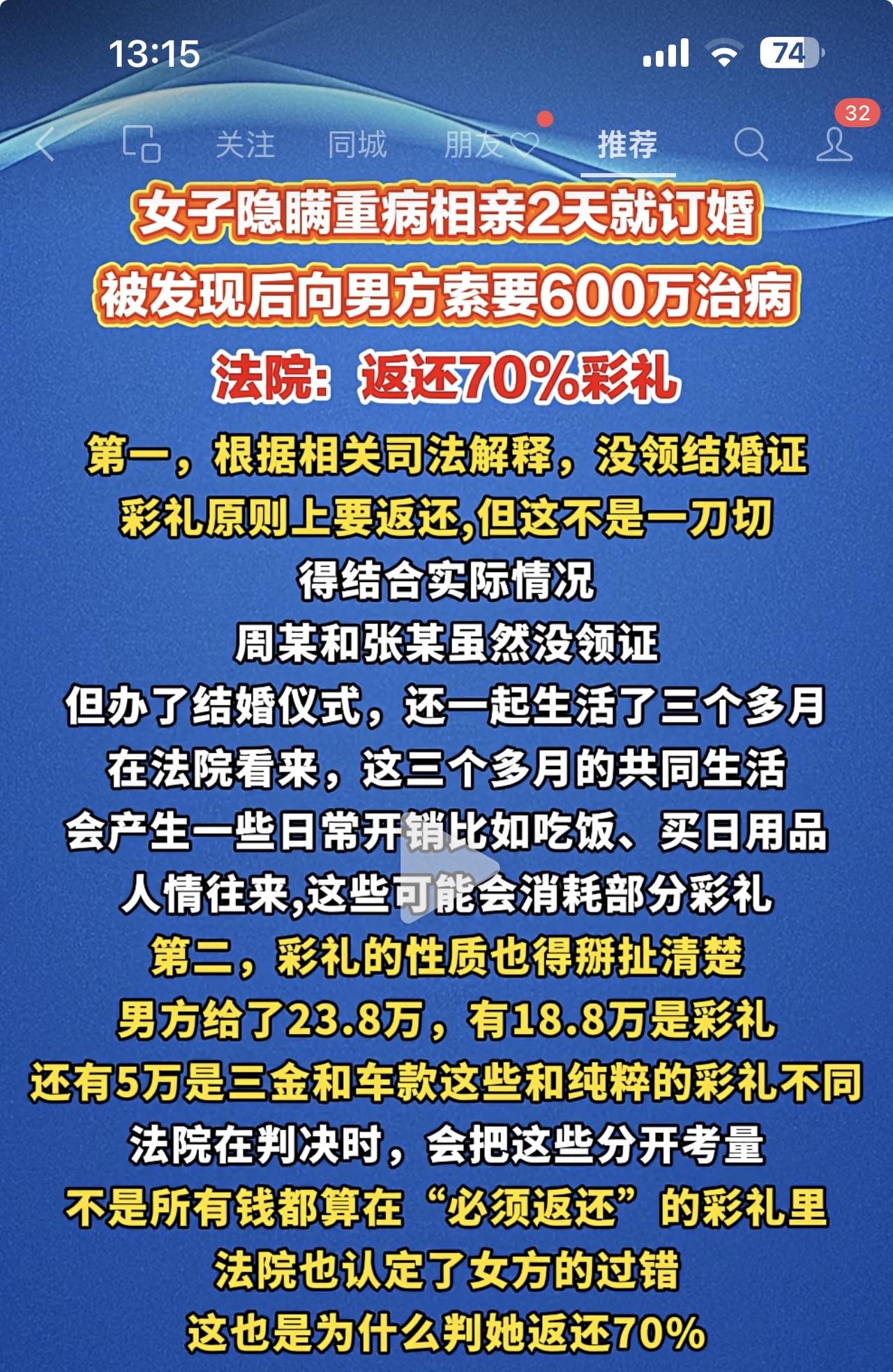 男女双方认识2天就订婚,随后结婚同居,男子发现女方有重大问题隐瞒,于是提出分手,要求返还彩礼,法院判决后,男子彩礼损失高达30%。 这是发生在河南周口的一件婚姻纠纷。双方在3个多月的短暂婚姻生活中,一些重大问题出现了!男子发现女方有尿毒症,竟然还要求自己贷款600万给她治病,觉得上当受骗,要求分手并返还先前支付的彩礼三金及车款共计23.8万元。 女子自然不肯把吃进嘴里的肉吐出来,直接把男子联系方式拉黑玩起了失踪,男子无奈之下将其起诉到法院,法院考虑两人同居期间生活支出,判决女子返还70%!男子为3个多月的婚姻生活付出了7.14万元的代价,月支出高达2万多元。 这样的婚姻试错成本谁受得了?你们怎么看这件事,评论区说说。