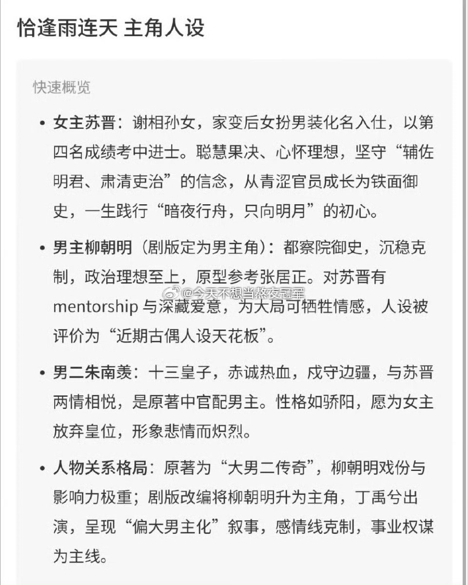 《恰逢雨连天》真是流水的女主,铁打的丁禹兮,现在女主又传到了刘浩存这里。 女扮男