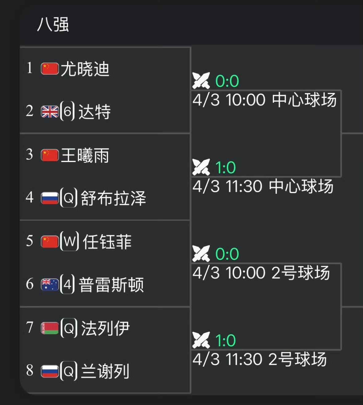 W100六安站女单1/4决赛,中国两金花带来意外惊喜,外卡选手任钰菲爆冷晋级四强,尤晓迪三盘鏖战晋级锁定法网资格赛席位。 任钰菲7-6(2)/7-6(4)战胜4号种子普雷斯顿。即时排名355。 尤晓迪6-1/0-6/6-4战胜六号种子达特,即时排名219。