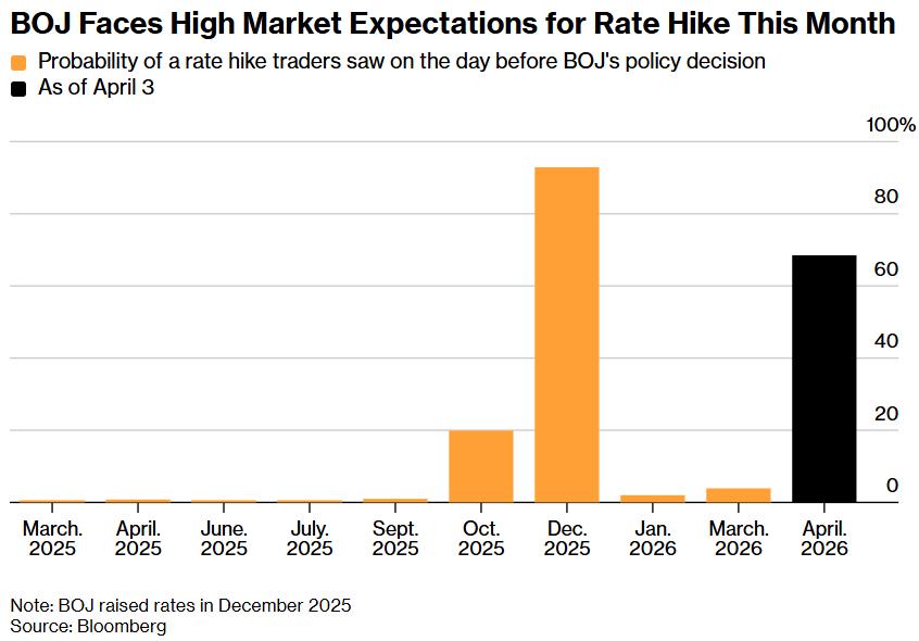 4月2号,日媒报道称,日本央行4月是否加息成了一大悬念,市场都在疯狂猜测,认为有70%的概率会加息。前日本央行首席经济学家关根敏隆称,伊朗战争使通胀上行风险大幅增加,4月加息具有可行性,到4月底便能看出中东局势的负面影响是否是暂时的。 日本央行执行董事中村浩二也表示会继续加息,同时还需关注中东冲突对经济和通胀的影响。燃料成本上升,企业更倾向于提价和涨工资,通胀压力比过去更大。2024年,日本央行结束大规模刺激并多次加息,12月将短期政策利率提升至0.75%,创下30年以来的最高纪录。
