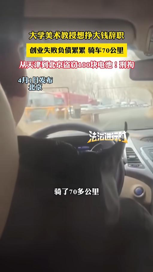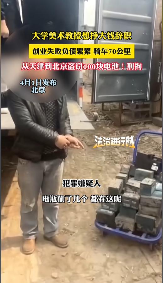 “简直炸裂!”近日,北京,一男子为了不被人发现,竟从天津骑车70公里,趁着夜深人静的时候,撬开电瓶车,偷了100块电池,但还是被警方掌握证据后抓获。审问之后,这人以前竟是位大学美术教授!网友:美术生再就业? 大学教授,多么光鲜亮丽的身份,多少人对此求而不得。也有些人不珍惜,想证明自己,下海创业。有人成功,就有人失败,甚至,还败得挺惨,走上了一条不归路。 据媒体4月1日报道,该男子以前是一位大学美术教授,因为嫌工资低,赚不到大钱,就选择了辞职,想要自主创业,期待着自己当一个富翁。没想到,事与愿违,他创业失败了,还欠了一屁股债。 为了还钱,他竟然动起了歪心思,想着提前“我偷电瓶养你”的梗,自己真的偷起了电池。他也不敢在自己家门口,每次都是骑行70多公里,从天津到北京作案。他都是半夜没人的时候,偷偷撬开电瓶车,把里面的电池盗走,几次下来,偷了有100多块。 尽管他做的如此隐蔽,但还是被警察抓住证据,最后将其抓获,失窃的电池也找回来了。事后,连办案民警都说,男子的反侦查意识很强。 网友看后表示,大学美术教授,已经快到美术生就业天花板了吧,这还有什么不知足的呢?难道还想学学那个落榜的美术生? 信息来源:《大学美术教授想挣大钱辞职,创业失败负债累累 骑车70公里,从天津到北京盗窃100块电池!刑拘 (记者:新华)》法治进行时