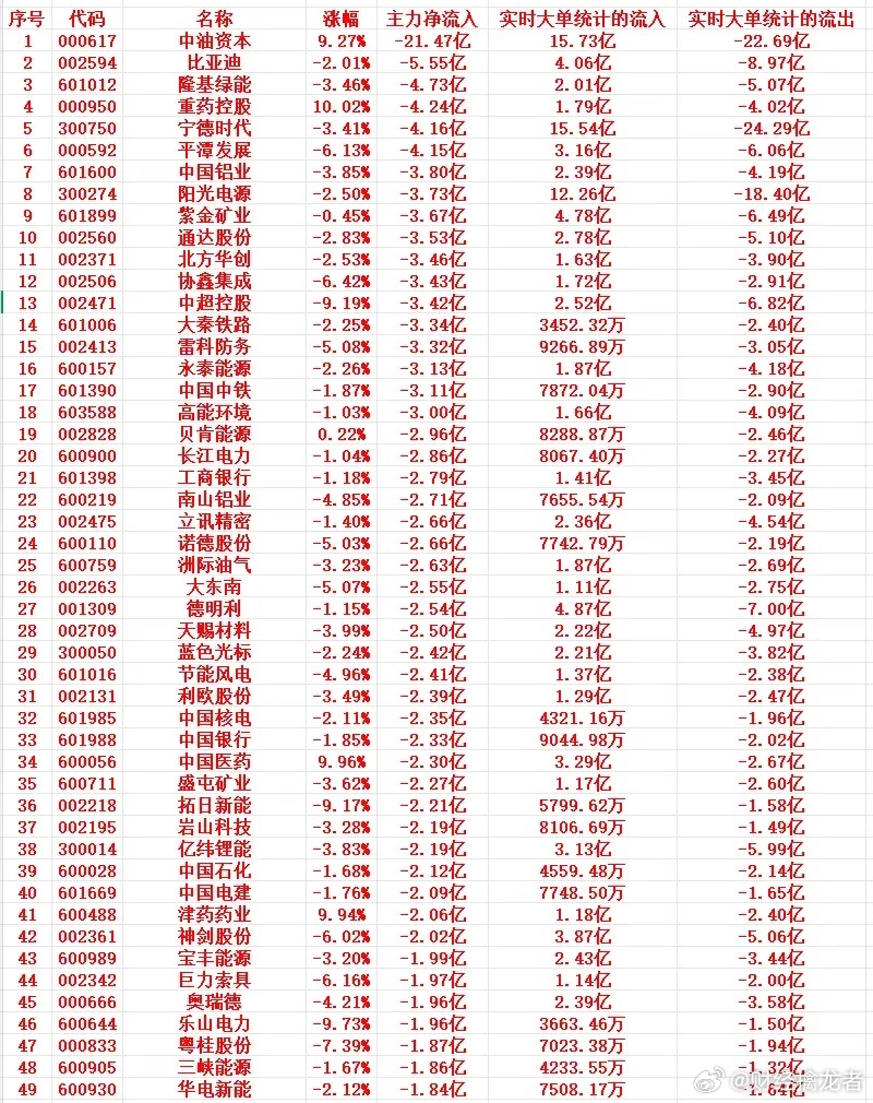 1 000617 中油资本 9.27% -21.47亿 15.73亿 -22.69亿2 002594 比亚迪 -2.01% -5.55亿 4.06亿 -8.97亿3 601012 隆基绿能 -3.46% -4.73亿 2.01亿 -5.07亿4 000950 重药控股 10.02% -4.24亿 1.79亿 -4.02亿5 300750 宁德时代 -3.41% -4.16亿 15.54亿 -24.29亿6 000592 平潭发展 -6.13% -4.15亿 3.16亿 -6.06亿7 601600 中国铝业 -3.85% -3.80亿 2.39亿 -4.19亿8 300274 阳光电源 -2.50% -3.73亿 12.26亿 -18.40亿9 601899 紫金矿业 -0.45% -3.67亿 4.78亿 -6.49亿10 002560 通达股份 -2.83% -3.53亿 2.78亿 -5.10亿11 002371 北方华创 -2.53% -3.46亿 1.63亿 -3.90亿12 002506 协鑫集成 -6.42% -3.43亿 1.72亿 -2.91亿13 002471 中超控股 -9.19% -3.42亿 2.52亿 -6.82亿14 601006 大秦铁路 -2.25% -3.34亿 3452.32万 -2.40亿15 002413 雷科防务 -5.08% -3.32亿 9266.89万 -3.05亿