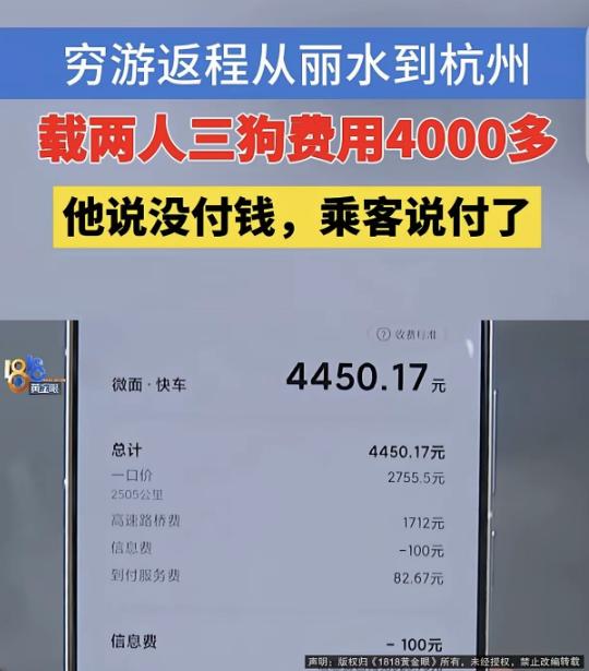 “玩不起!”浙江,一男子开面包车穷游西藏,为了省钱,在丽江拉上2个女子和她们的3条狗,全程2505公里,一共4450.17元车费。谁知,等到目的地后,2名女子却说车费已经在平台支付了,30分钟到账,然后拍屁股走人,男子打开平台一看,却发现一分钱都没收到。 前阵子,薛先生跟老婆提出了自己想要去西藏的想法,老婆虽然满心担心,怕他一个人跑几千公里的路不安全,也怕路上出点意外没人照应。 但得知去西藏是薛先生多年来的心愿后,老婆最终还是点了头,只反复叮嘱他,路上一定慢点开,每天都要发消息报平安。 为了这趟西藏之行,薛先生提前半个多月就开始忙活起来,一点都不敢马虎。 他把面包车开到附近的维修店,让师傅从头到尾彻底检修了一遍,刹车、油路也都仔细检查调试好,就怕路上开着开着出故障,前不着村后不着店的,到时候叫天天不应、叫地地不灵。 车厢里也被他收拾得干干净净,他特意跟经常自驾的朋友请教,备上了矿泉水、压缩饼干、厚外套,还有一个简易的急救包,里面装着创可贴、退烧药之类的东西。 前往西藏的旅程,一路上的风景是真的美,路边的草原一望无际,偶尔能看到成群的牛羊在悠闲地吃草,慢悠悠的,特别惬意。 可再美的风景,也抵不过独自开车的疲惫。 有时候一天要开十几个小时,肩膀酸得抬不起来,眼睛干涩得都快睁不开了。 而且这趟旅行的开销,也比薛先生预想的要大很多。 他已经尽量省吃俭用了,吃饭就找路边最便宜的小饭馆,一碗面、一份炒饭就打发了,住宿环境简陋点也不在乎,能遮风挡雨就行,可车跑两千多公里,油钱也花了不少。 等薛先生逛完西藏,返程的时候,算了一下账,这趟旅行花了不少钱。 薛先生在路过丽江的时候,他突然想到,自己这面包车空着也是空着,不如在打车平台上接个顺风车单子,拉几个乘客,挣点油钱,多少能减轻点这趟旅行的负担。 下单的是两个年轻姑娘,而这两个姑娘,她们还带了三条狗。 其中一个姑娘不好意思地跟薛先生解释,说能不能带上这三条狗,它们从小就跟在身边,离不开人,要是不带,她们根本没法出行,还一个劲地跟薛先生道歉,说不会让狗捣乱。 薛先生想着反正两个姑娘要到杭州,他这趟跑的顺路,而且路上既能有个伴儿,不用再一个人孤单开车,还能挣点油钱,于是他立马就答应了。 那三条狗特别乖巧,大多时候都安安静静地趴在座位底下。 为了能尽快把俩姑娘送到目的地,也为了能早点拿到车费,薛先生几乎没怎么休息,除了必要的吃饭、加油和短暂的休息时间,其余的时间都在开车。 就这么连轴转,他终于顺利把车开到了俩姑娘指定的位置。 车子一停稳,俩姑娘立马就打开车门,急急忙忙地收拾自己的行李。 薛先生喊住她们,语气尽量委婉:“咱们这趟行程的车费,你们还没支付呢,平台上显示还是待支付状态,麻烦你们付一下呗。” 没想到,俩姑娘听了之后,特别淡定地说:“我们已经在平台上付过了,你再耐心等一等,估计一会儿就显示收到了。” 薛先生心里半信半疑,可看着俩姑娘一脸笃定的样子,说得有模有样,他又不好再多说什么,只能点了点头,说那自己就再等一等。 可十分钟、二十分钟过去了,订单状态一点变化都没有。 薛先生赶紧拨通了其中一个姑娘的电话,语气也变得有些着急。 “已经过去这么久了,我这边还是没收到车费,要不你再检查一下,要是没付的话,麻烦付一下吧,我这也是辛辛苦苦开了好久的车,不容易啊。” 可电话那头的姑娘,依然坚持说已经付过了。 薛先生还想再追问几句,可对方却找了个借口,匆匆挂了电话。 薛先生心里越来越慌,也越想越觉得不对劲,赶紧拨通了平台的客服电话,把事情的来龙去脉,一五一十地跟客服说了一遍,希望客服能帮忙解决。 客服听完薛先生的描述后,查询了一下订单信息,发现这两个乘客,根本就没有支付车费。 之后,薛先生再次联系两个姑娘,可那俩姑娘依旧死不承认,还拿出了一张手机截图,说是自己当日的付款凭证,让薛先生看,试图蒙混过关。 薛先生仔细看了一眼那张截图,就当场指出,这张截图是伪造的,根本不是当日的付款凭证。 见自己的谎言被当场戳穿,那俩姑娘依旧不依不饶。 无奈之下,薛先生只能联系了当地的记者,只盼着记者能出面介入调解,帮自己讨回那笔4450.17元的车费,弥补自己连日来的辛苦付出。 记者了解情况后,当即答应尝试沟通调解。 可无论记者怎么联系对方、辗转寻找她们的踪迹,那两名女子全程避而不见。 记者也没有办法,只能再次联系了打车平台的客服,详细询问了这件事的处理进度。 客服回应,经平台核实,两名女子确未支付车费,目前平台已正式介入,会尽快安排工作人员追缴该笔款项。 同时将对二人的平台账号予以封号,杜绝其再以相同方式欺骗其他司机、造成他人损失。 (信息来源:1818黄金眼)