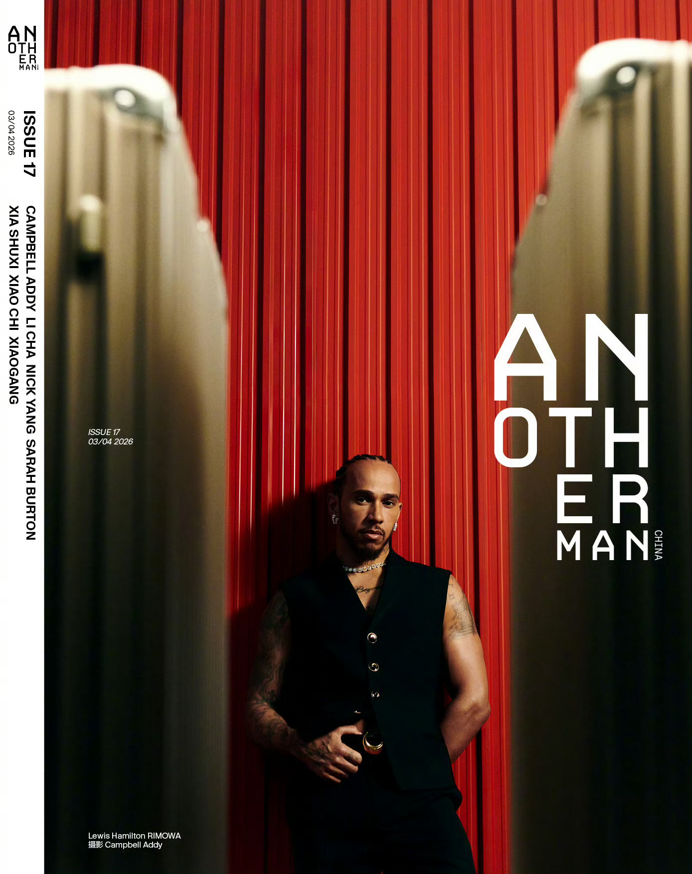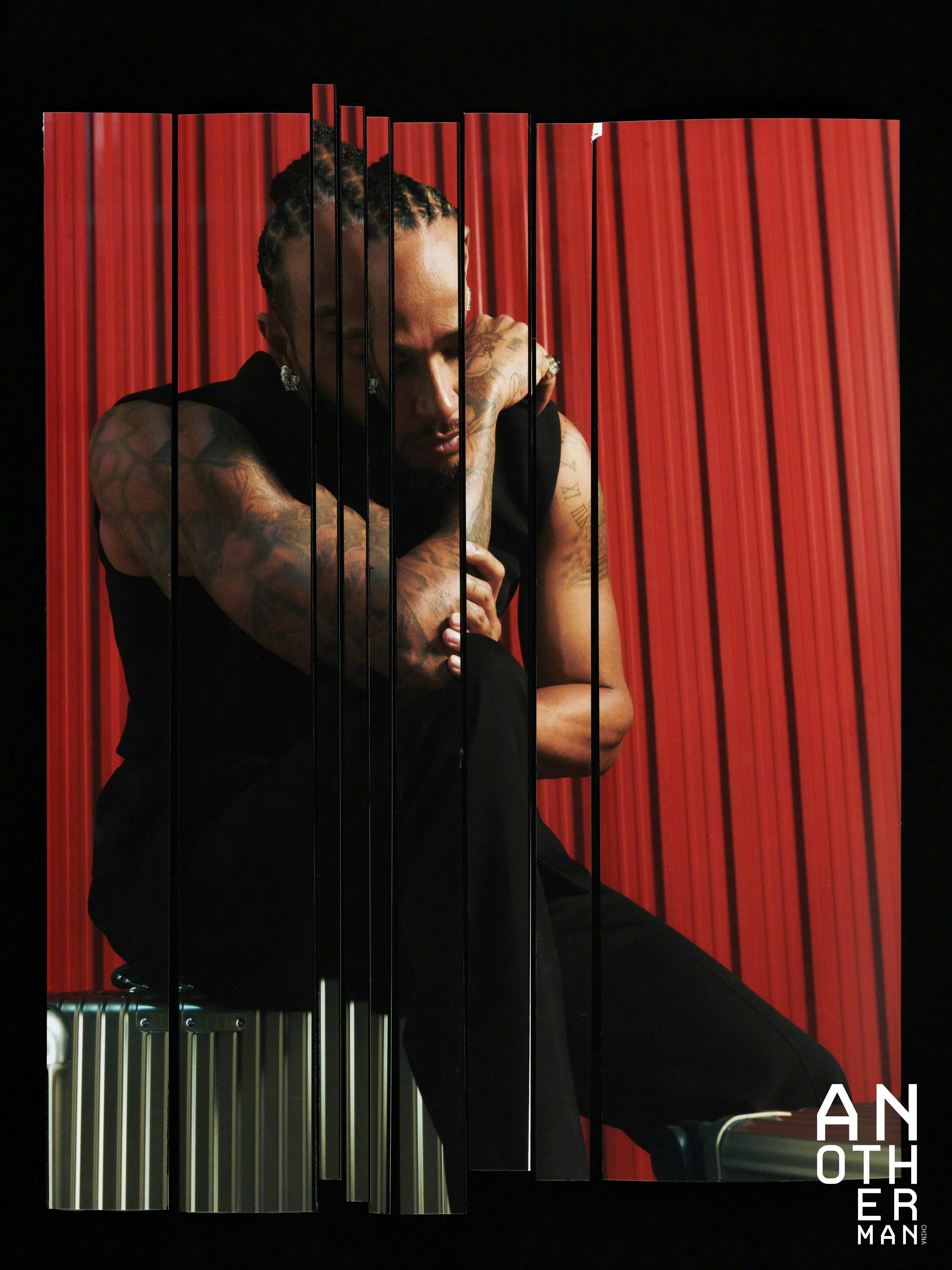 Another Man 中文版 Issue 17, RIMOWA 全球品牌大使刘易斯 · 汉密尔顿。这就是很好有审美的拍摄。很简单。很减法。 图一这扭动的线条红黑的配色。在刘姐性感的姿势下整张图片都动感了起来。 就像赛车跑道一样。 这需要一定的抽象思维。 我看到这张图就感受到了“动感” “赛车跑道” 刘姐这么松弛的一扭。就更高级了。 实则 它的纹理线条合适日默瓦的行李箱条纹。 美术制片厉害。