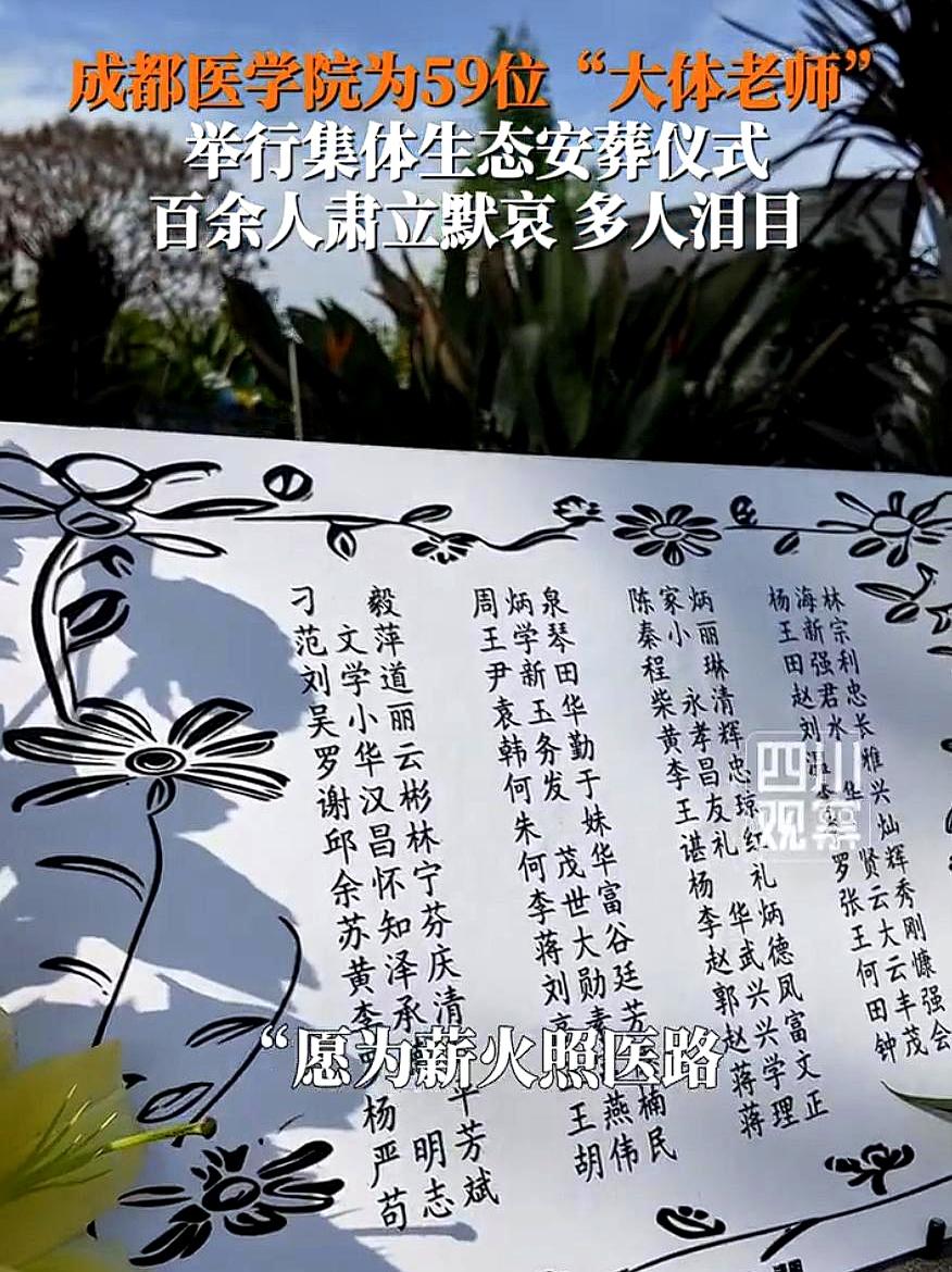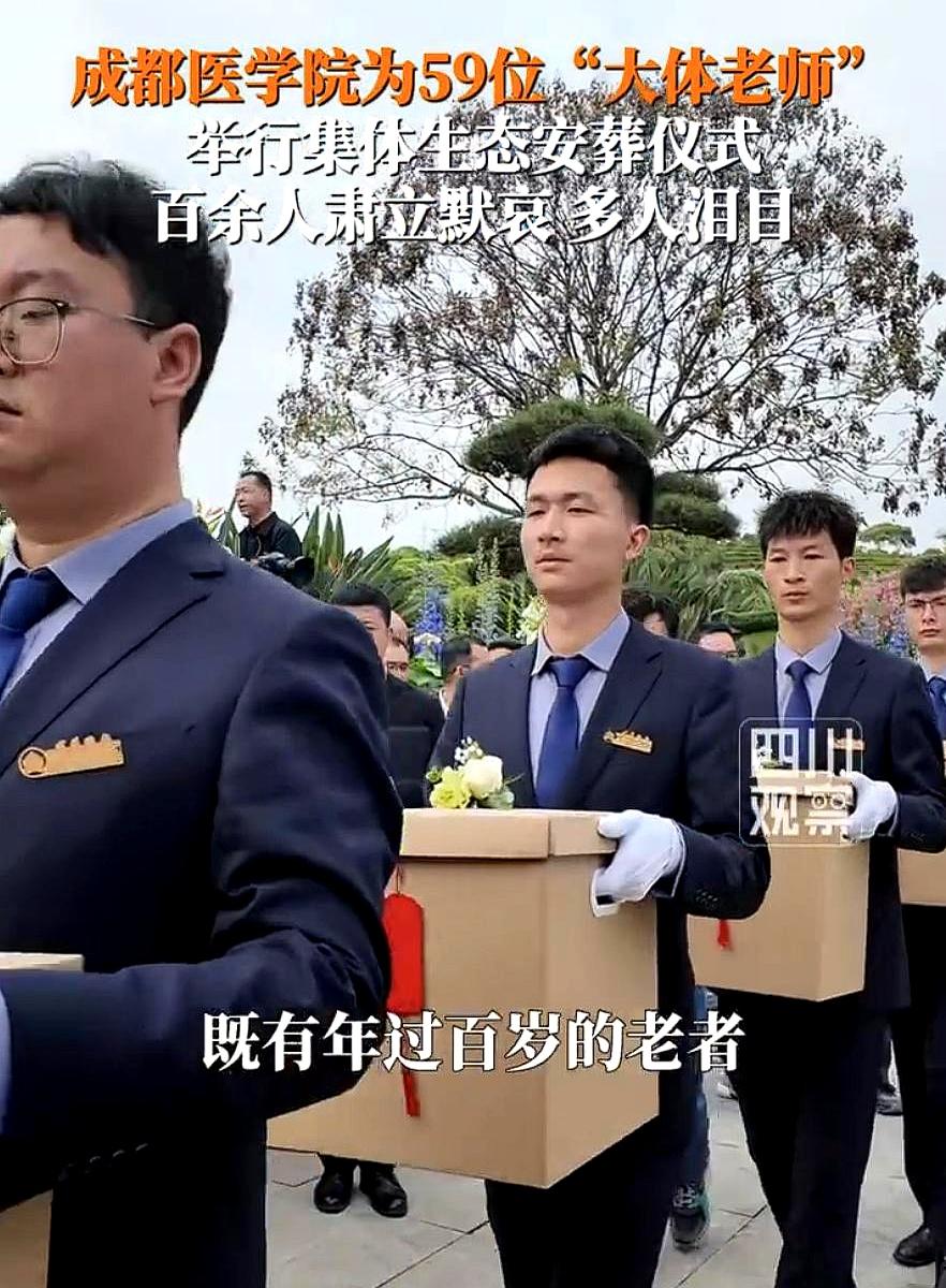 你见过最震撼的“课堂”在哪里? 我告诉你,是在墓园。 那天成都医学院上百人站那儿,连风都静了,就为了送59位“大体老师”最后一程。 说白了,他们就是捐献遗体给医学院上课用的无名英雄,皮肤可能被学生轻轻划过,骨骼被仔细研究过,最后连名字都不留。 这可不是普通葬礼,是真正的生态安葬,埋下去连墓碑都不立,彻底回归自然。 想想看,这些人可能就是你小区里那位总笑眯眯晨练的老大爷,或是菜市场总爱多给你一把葱的大姐,他们生前普通,死后却用身体当了医学生们的“活教材”。 医学生拿着手术刀的手发抖的时候,第一个面对的“患者”就是他们啊。 这种奉献,比捐钱捐物难多了,对吧? 现在网上总说“格局打开”,这才是真正的格局打开吧? 所以咱琢磨琢磨,要是以后科技进步了,还需要“大体老师”吗?