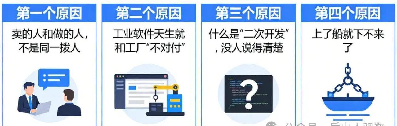 2024年,一家汽车厂本想150万搞定MES系统,谁知二次开发层层加码,直飙400万,工厂彻底陷泥潭? 工业软件项目从头到尾,总藏着这类弯弯绕。售前时,销售团队打包票,说平台灵活,什么需求都能二次开发,合同里只模糊提一句“按需调整”。结果实施一启动,团队就变脸:特殊工艺要定制,报价10万起;接口对接得额外掏腰包。系统勉强上线,维护阶段更棘手,新版升级让旧开发失效,又是一笔笔钱砸进去。用户前后投两倍预算,却换来勉强能转的系统,数据迁移难如登天,换厂商等于从头来过。 这坑根子在哪儿?销售冲业绩乱许诺,实施队控成本推三阻四,用户成夹心饼干。更深层,工业软件本是通用货,工厂工艺各异,个性化需求总撞墙。二次开发定义模糊,点鼠标叫配置,动代码就收费,用户信息不对称,只能被动挨宰。技术架构封闭,自家工具绑死用户,升级一变卦,全盘重来。 拿案例装备制造厂上PLM,花350万起步,接口和界面定制后飙到500万,还延期一年。另一小电子厂30万MES,自招人开发省了15万费,可工程师走人后,维护成火烧眉毛。据2023年IDC报告,制造业数字化项目中,超75%企业遇二次开发成本超支30%以上,这数据印证了结构性顽疾:销售实施脱节,个性化冲标准化。 本质上,二次开发是标准化与个性化的拉锯战。过度定制锁死用户,纯标准又用不转。聪明路子,把每行代码当长远投资,算清维护寿命和升级兼容。靠谱厂商不光说能改,还帮盘算成本路径,帮企业避开无底洞,转而买到真解决问题的那份能力。