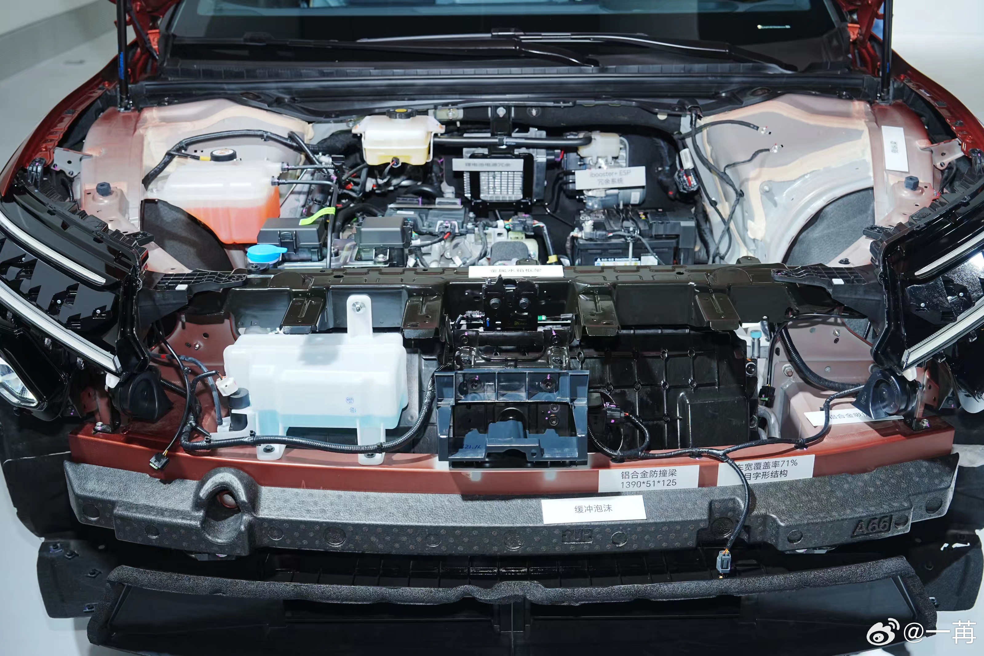 1 铂智 7 前舱就有 13 根梁,分为 5 横 6 纵 2竖,除了前舱,前后车门+车尾+二排座椅背后+底盘全部都是结实的钢梁。