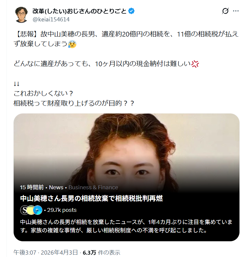 日本的遗产税真的太离谱了中山美穂的长子因无法在10个月内支付11亿日元的遗产税,