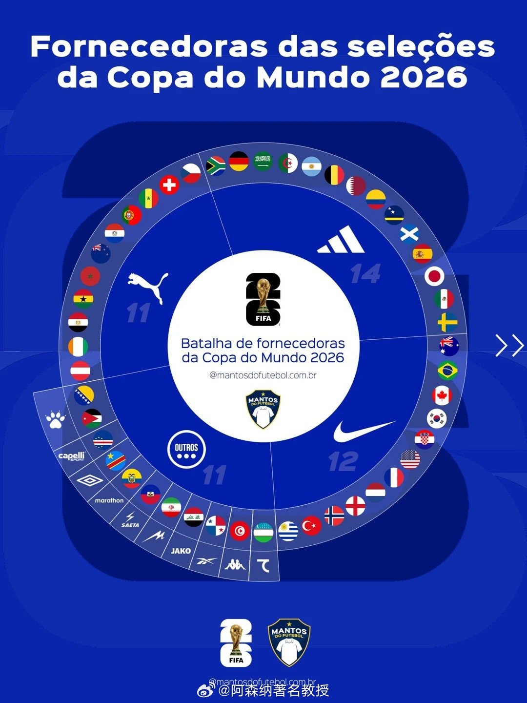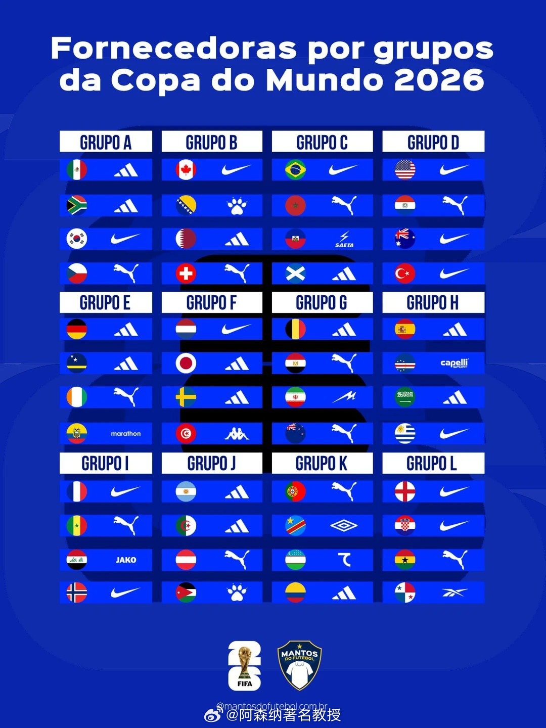 阿迪达斯、耐克、彪马三大巨头联手承包了2026美加墨世界杯超过77%的球衣品牌。阿迪达斯14队: 阿迪达斯稳坐头把交椅,数量质量均有保证。德国、阿根廷、西班牙依旧稳健,日本和墨西哥也有可能以黑马姿态杀出。墨西哥、南非、卡塔尔、苏格兰、德国、库拉索、日本、比利时、西班牙、沙特阿拉伯、阿根廷、阿尔及利亚、哥伦比亚、瑞典。耐克12队: 虽然数量略少,但胜在精。三大夺冠热门桑巴军团巴西、高卢雄鸡法国和三狮军团英格兰,还有东道主中的美国和加拿大,全都在耐克阵营。韩国、加拿大、巴西、美国、澳大利亚、荷兰、乌拉圭、法国、挪威、英格兰、克罗地亚、土耳其。彪马11队: 彪马近年来势头极猛,不仅统治了非洲军团(塞内加尔、摩洛哥、加纳、科特迪瓦),C罗领衔的葡萄牙转投彪马也是一大看点,葡萄牙也将迎来从耐克转投彪马后的世界杯首秀。瑞士、摩洛哥、巴拉圭、科特迪瓦、埃及、新西兰、塞内加尔、奥地利、葡萄牙、加纳、捷克。其他品牌: 卡尔美2队:约旦、波黑 卡佩利:佛得角 茵宝:民主刚果 马拉松:厄瓜多尔 赛塔:海地 麦吉德:伊朗 雅科:伊拉克 锐步:巴拿马 卡帕:突尼斯七剑:乌兹别克斯坦