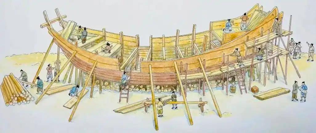明朝宝船能在远洋中平稳航行,核心在于船身左右完全对称。没有现代激光、水准仪等精密仪器,明代工匠依靠传统几何原理、手工测量工具与标准化流程,实现了船体结构的精准对称,支撑起庞大船体的平衡与稳定。 龙骨作为船体对称的基准线,是测量校准的第一步。工匠先在船台中央划出笔直的中轴线,用长木杆与墨斗弹线确定位置,再将主龙骨沿中轴线固定。龙骨两端与中段设置多个测量点,用等长绳索反复比对两侧距离,确保龙骨无丝毫偏移。 南京宝船厂遗址显示,龙骨定位误差控制在寸级以内,为整船对称打下基础。肋骨安装以龙骨为中心对称展开。每根肋骨从龙骨处向两侧延伸,长度、弧度完全一致。工匠预先制作标准模板,按船型设定肋骨弯曲度,安装时用“丈杆”与“矩尺”双重测量。 丈杆标有精准刻度,核对左右肋骨伸出长度;矩尺保证肋骨与龙骨垂直,防止倾斜偏差。多层肋骨依次安装,形成左右镜像的骨架结构。 船壳板铺设遵循对称拼接规则。船壳采用鱼鳞式搭接,每块板的长度、厚度、拼接位置左右对应。工匠用 “绳测法” 校准弧度,将绳索一端固定在龙骨,另一端沿船壳自然弯曲,左右舷比对绳索弧度与长度,确保曲线完全吻合。 拼接缝隙用桐油灰填充,厚度均匀,避免因单侧缝隙过大影响平衡。水线与吃水深度的对称控制尤为关键。船体成型后,工匠在船舷两侧划出统一水线,以龙骨为中点向左右延伸。 水线高度用 “水平竿” 测定,竿上设浮标,两端同时放置船舷,待浮标静止后标记位置,保证两侧水线绝对水平。远洋航行时,左右吃水深度一致,船体不会侧倾,抗风浪能力大幅提升。 多层甲板与舱室布局同样对称设计。甲板横梁、支柱以中轴线为界左右对称分布,间距、尺寸完全相同。水密隔舱的隔板位置、大小左右对应,单个舱室容积、形状一致。《南船纪》记载,各类船只舱室布局有严格图谱,工匠按图施工,确保人员、货物装载后重心居中。 测量工具虽简易却精准。常用墨斗弹线定位、矩尺测直角、丈杆量长度、水平竿测平衡,工具材质以木、竹为主,刻度按营造尺精准划分。工匠世代传承操作手法,测量时多人协同复核,关键数据反复校验,减少人为误差。 龙江船厂设专职 “勘量官”,每道工序测量记录在册,不合格立即返工。对称设计直接影响船只性能。宝船等巨舰左右重量、受力均匀,航行时阻力平衡,航向稳定。 遭遇风浪时,对称结构能均匀分散冲击力,减少船体扭曲变形。抗倭海战中,明朝战船对称布局让火炮射击、船只转向更精准,作战效率远超不对称设计的敌方船只。 明朝造船的测量技术,是实用主义与工程智慧的结合。没有复杂仪器,却以几何原理、手工工具与严格流程,实现了船体精准对称。 这种以基准为核心、层层复核的测量体系,保障了明朝船只的质量与性能,也体现了古代工程 “差之毫厘、谬以千里” 的严谨态度,为后世船舶建造提供了朴素而高效的借鉴思路。