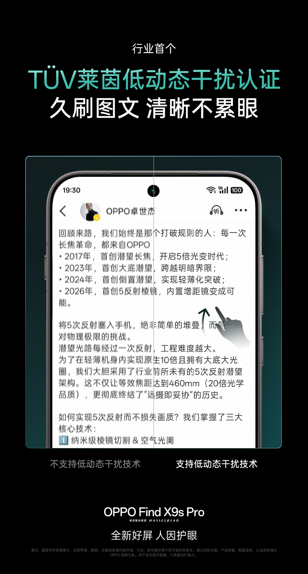 而且Find X9s Pro和Find X9 Ultra上的全新1nit 明眸护眼屏可实现极低亮度下清晰显示,深夜关灯后躺床上刷视频也不会被屏幕强光晃得睁不开眼,同时获得了行业首个莱茵低动态干扰认证,还拿到了十大专业护眼认证。