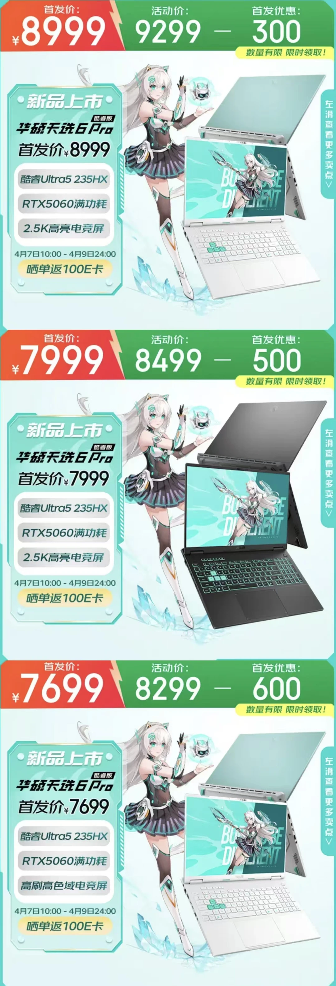 刚刚我注意到,三款华硕天选6 Pro酷睿版开启预约了,4月7日10点—4月9日24点首发开售。