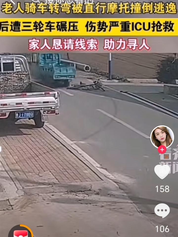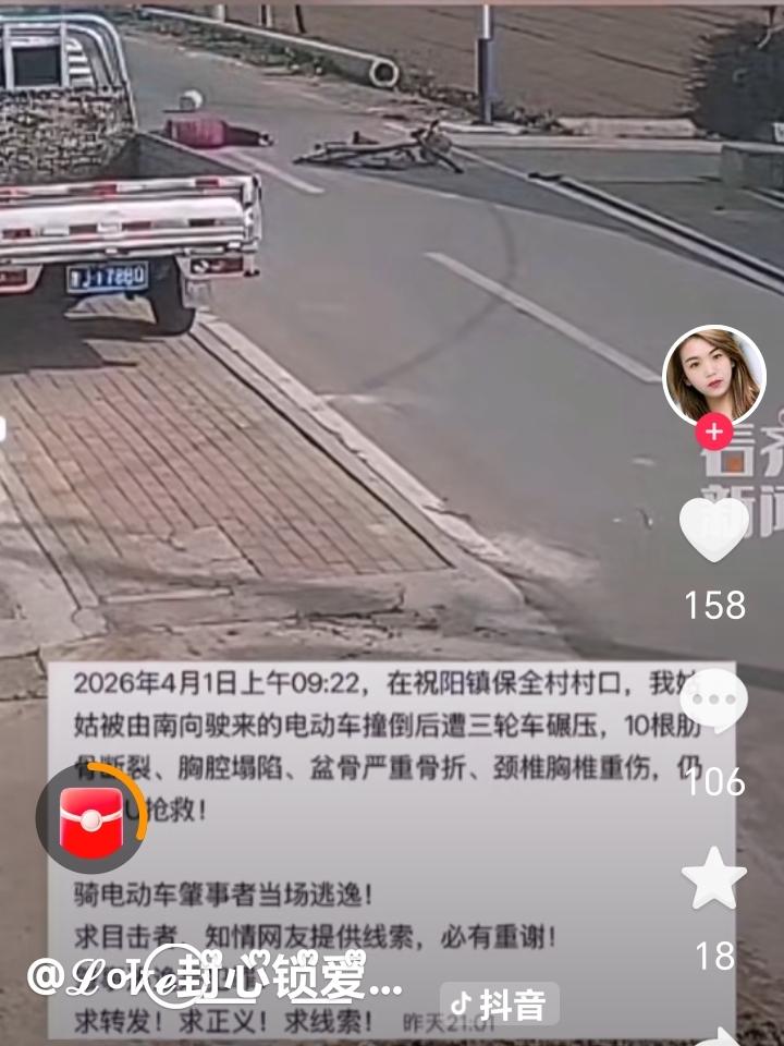 村口十秒的碾压…… 泰安保全村的水泥路,还留着道浅浅的车辙。4月1日上午,八旬老人的自行车刚转过弯,车铃还在响,身后的两轮车就撞了上来——"砰"的一声闷响里,老人连人带车翻在路中间,蓝布褂子被车轮带得掀起一角。 撞人的司机回头瞥了一眼,车把一拧就没了影,只留下歪倒的两轮车,车筐里的菜撒了一地。老人趴在地上,手还攥着车把,想撑起身子时,三轮车的影子突然罩了过来。 十秒的功夫,车轮从他身上碾过。村民们跑出来时,三轮车司机正跳下车,脸色白得像纸,"我没看见...真没看见..." 老人的肋骨断了十根,咳出的血染红了胸前的口袋,那里还揣着张刚买的烧饼,咬了一半。 ICU的灯亮了三天。家属举着老人的照片在村口打听,照片里的他坐在门槛上,手里拿着拐棍笑。有人说撞人的两轮车是红色的,有人记得司机穿件蓝外套,可没人能说清车牌号。村口的监控对着树,只拍到模糊的影子。 现在村口立了块警示牌,红漆写着"减速慢行 注意行人"。有村民把自家的旧沙发搬到路边,说"能挡挡视线,让司机多看看路"。被撞的自行车修好了,靠在老槐树下,车铃偶尔被风吹响,像在重复那天上午的急刹声。 你见过肇事逃逸的瞬间吗?那些转身跑掉的背影,该用什么来追上? 村口肇事逃逸 十秒的悲剧