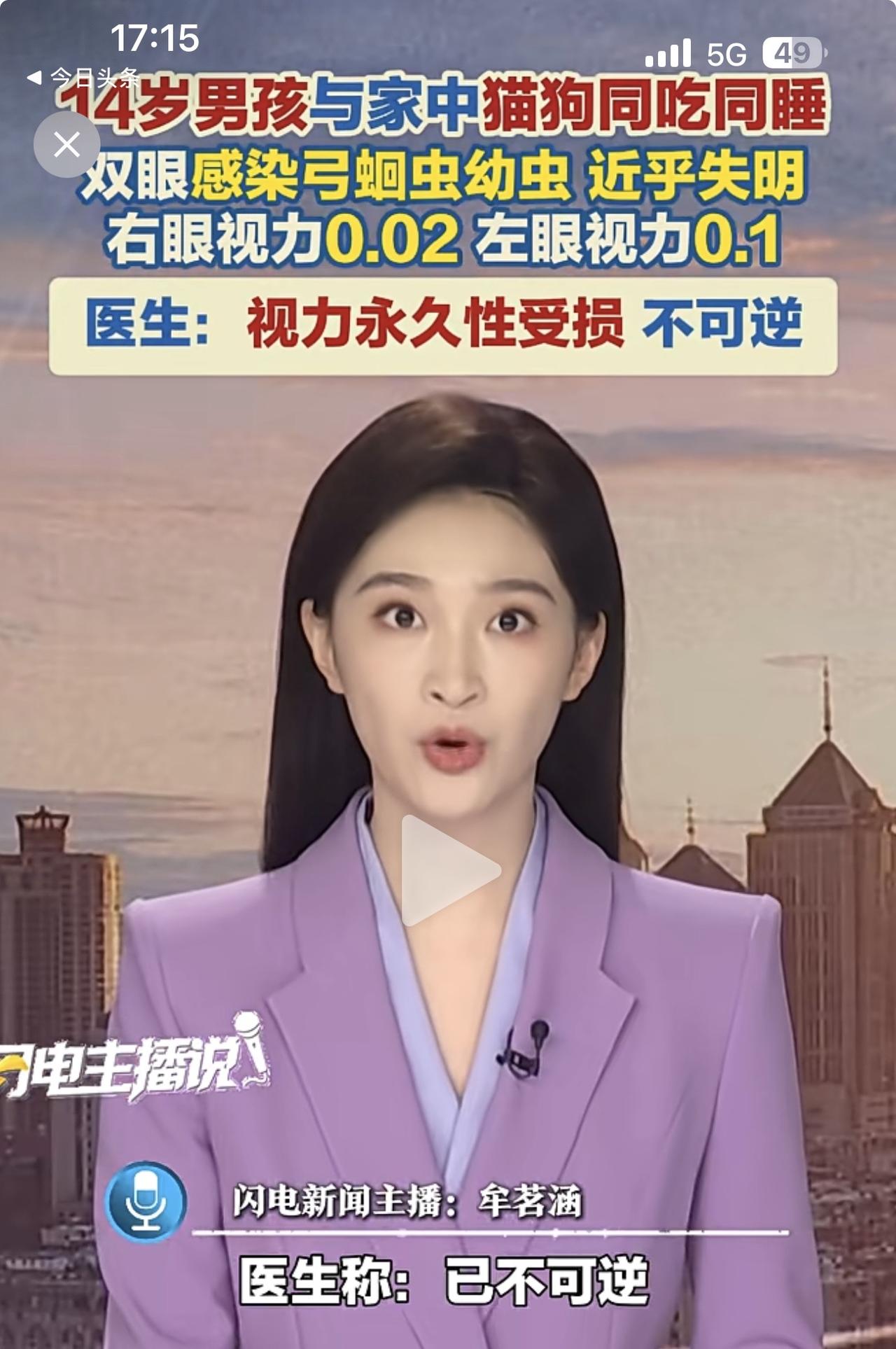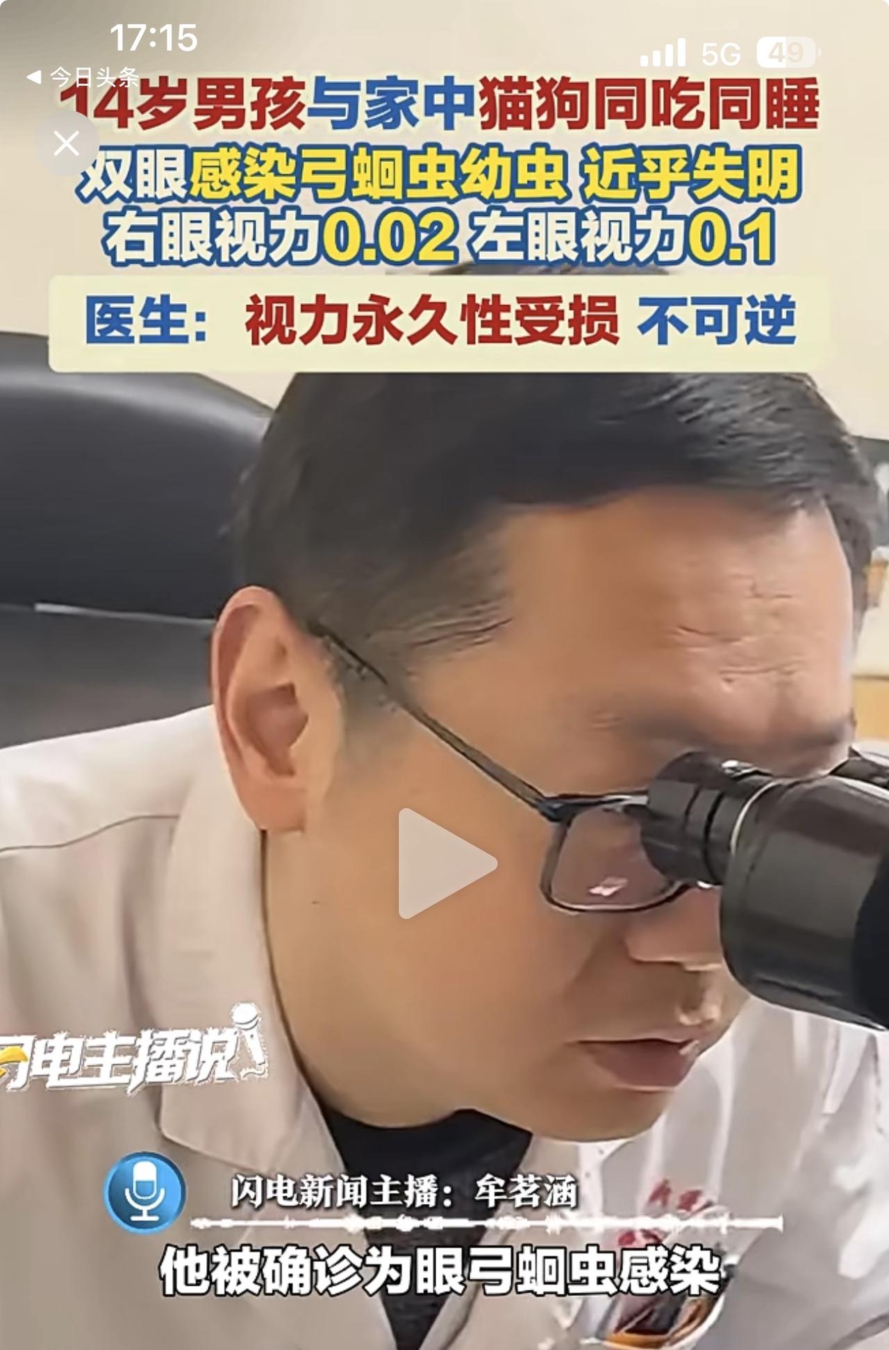 14岁男孩与宠物猫狗过于亲昵,不幸感染弓蛔虫幼虫,导致双眼视力永久性受损!近乎失明。 根据最新的行业报告,2025年数据显示,中国城镇宠物猫约 7289万只,宠物狗约 5343万只,猫狗的总数量约为 1.26亿只,同比增长1.8%。 随着婚育率下降,少子化家庭增加,未来宠物市场还会进一步扩大,有多少人了解宠物猫狗对健康的潜在影响呢? 养猫养狗的家庭看过来,这个案例教训深刻啊!做好猫狗卫生和驱虫防疫措施,告诉孩子不要过于与猫狗亲昵,亲昵后做好洗手清洁十分必要。