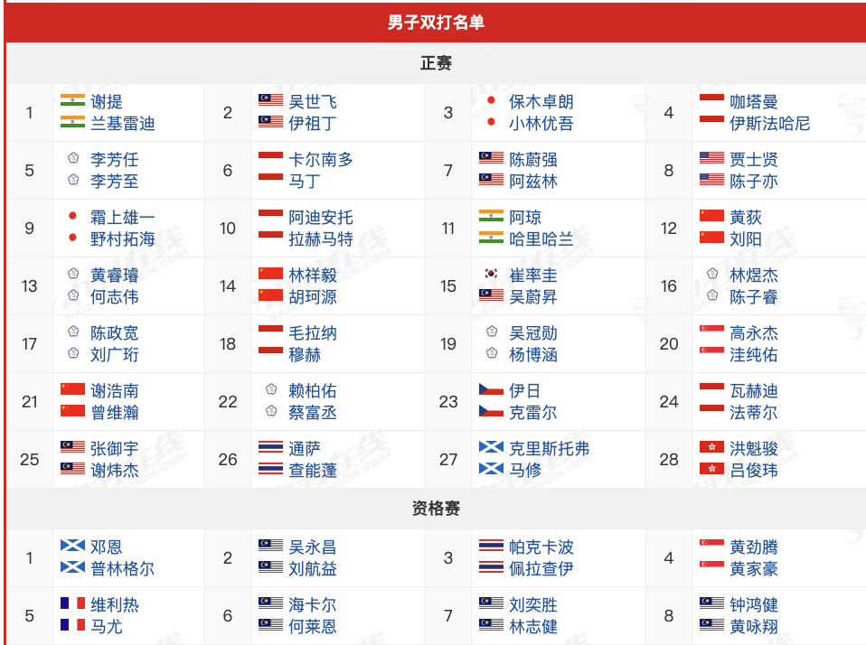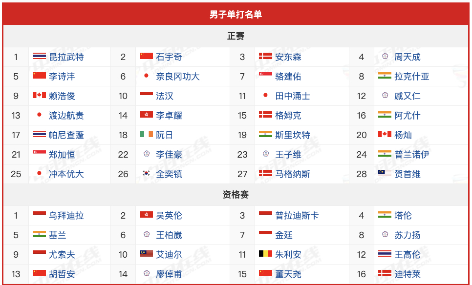 男单:石宇奇、李诗沣、胡哲安Q13、董天尧Q15、朱轩辰R1