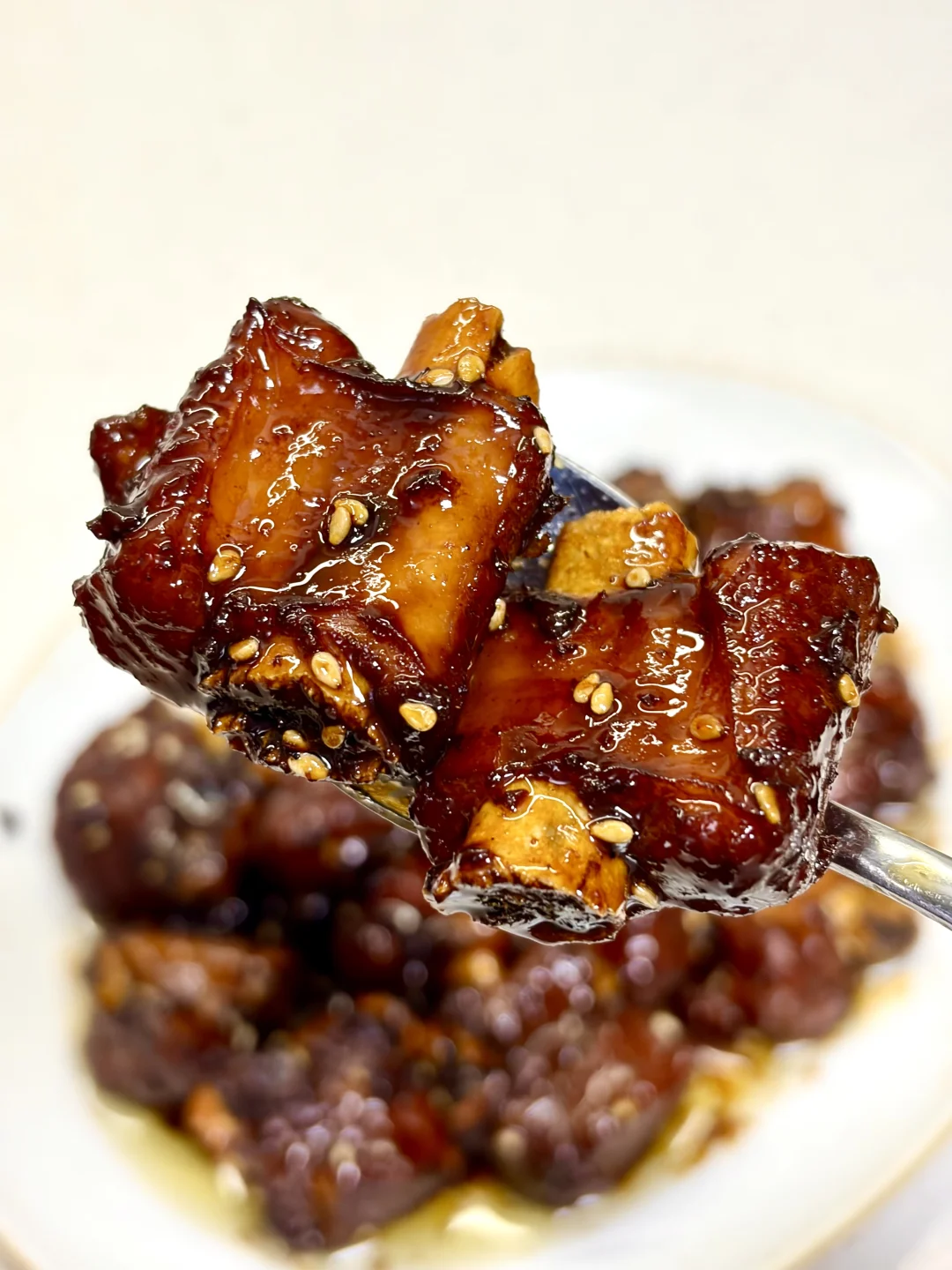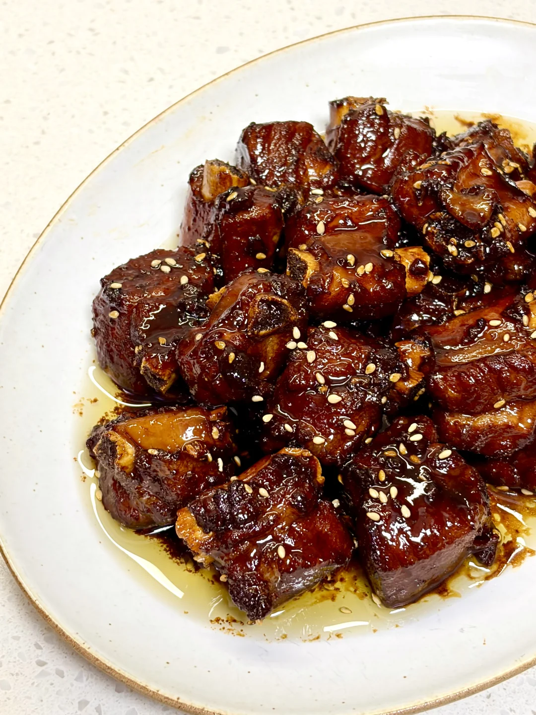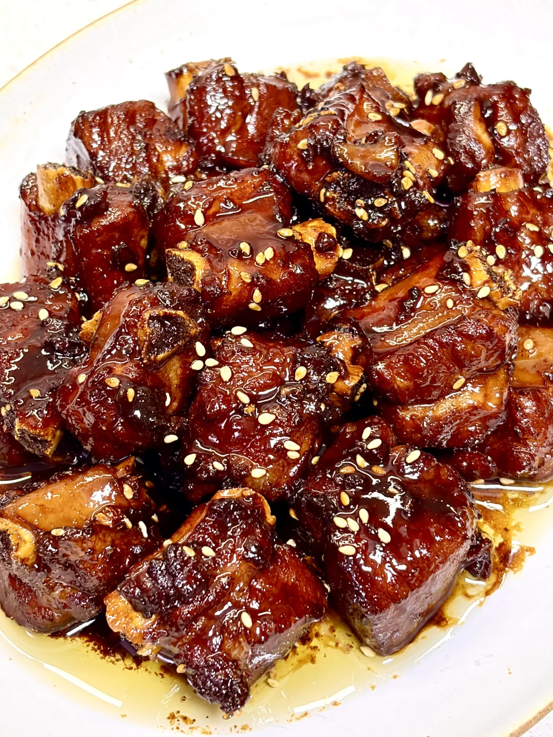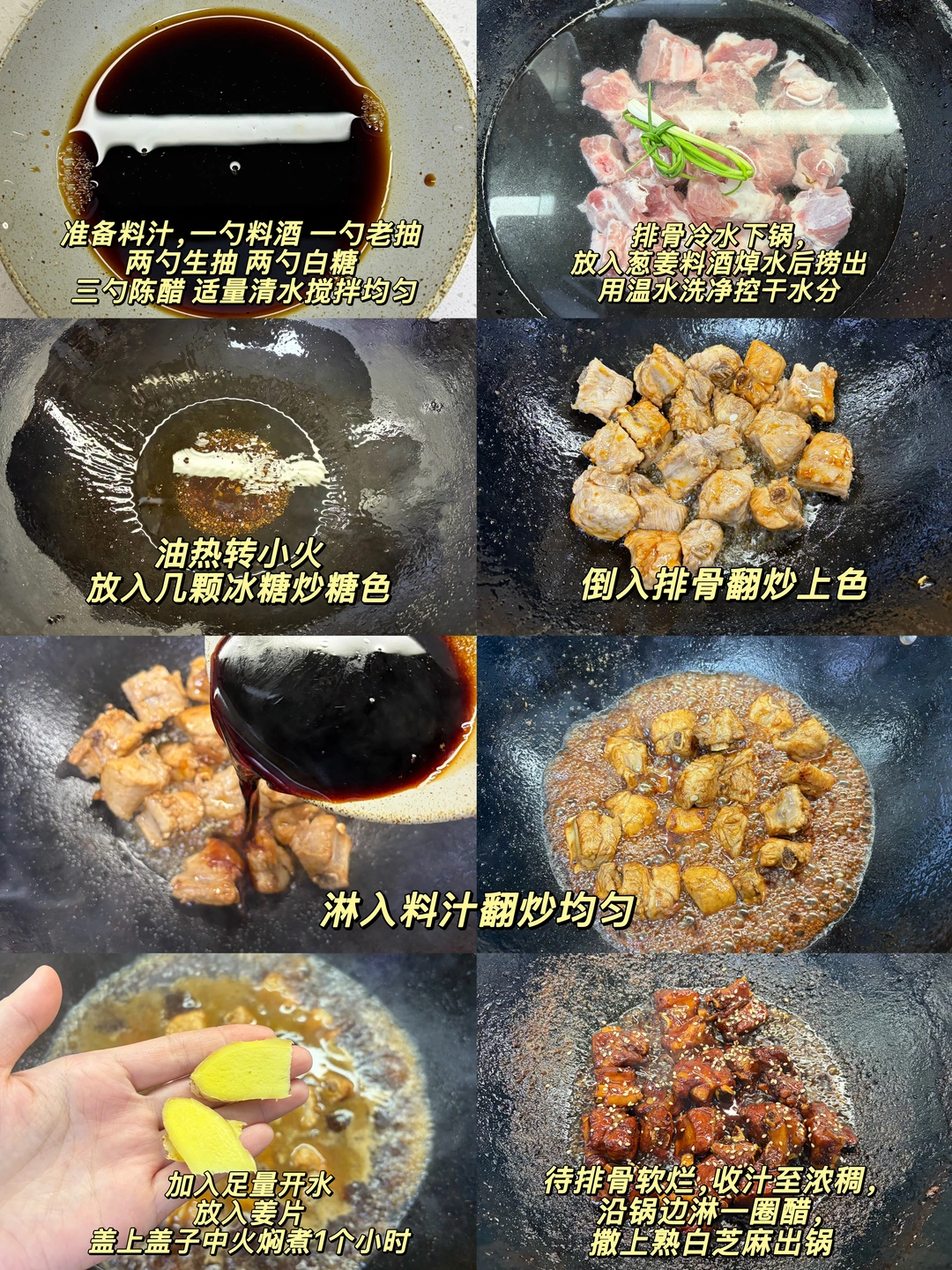 软烂脱骨的糖醋排骨,酸酸甜甜的,老人小孩都爱吃,做法简单,好吃到舔手指,根本停不下来~ 1️⃣:排骨冷水下锅,放入葱姜料酒焯水后捞出用温水洗净控干水分 2️⃣:准备料汁,一勺料酒 一勺老抽 两勺生抽 两勺白糖 三勺陈醋 适量清水搅拌均匀 3️⃣:油热转小火放入冰糖炒糖色,倒入排骨翻炒上色,倒入料汁翻炒均匀,加入足量清水,放入姜片,水开转小火炖1小时左右,待排骨软烂,收汁至浓稠,沿锅边淋一圈醋,撒上熟白芝麻出锅