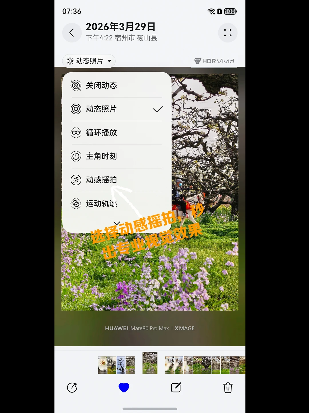 这是华为独特的视觉功能,拍摄一张动图live图,要求主体人物在动态中,背景保持静态,拍摄完后点击选择动感摇拍,一张专业动态视觉的效果就出现了。