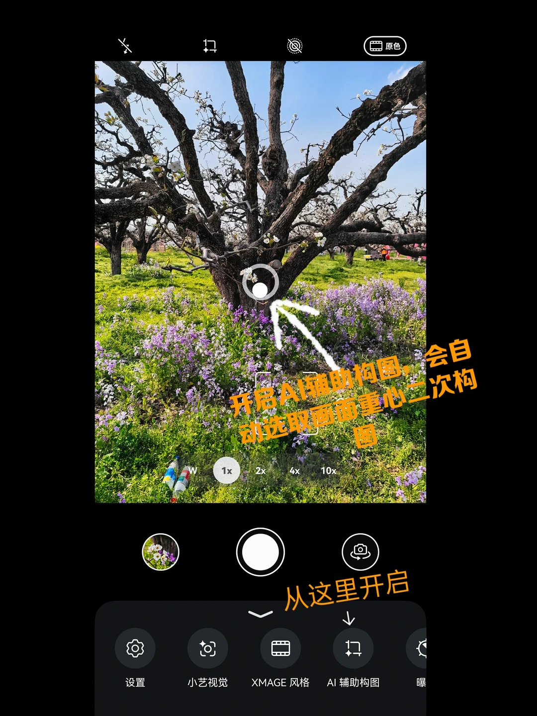 面对繁花似锦的梨园,避免画面杂乱是关键。AI辅助构图会识别主体并微调位置,让焦点更突出。
