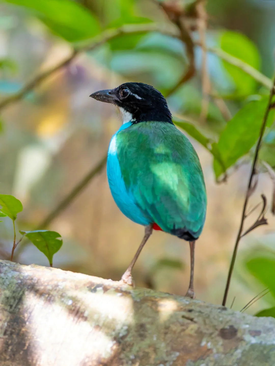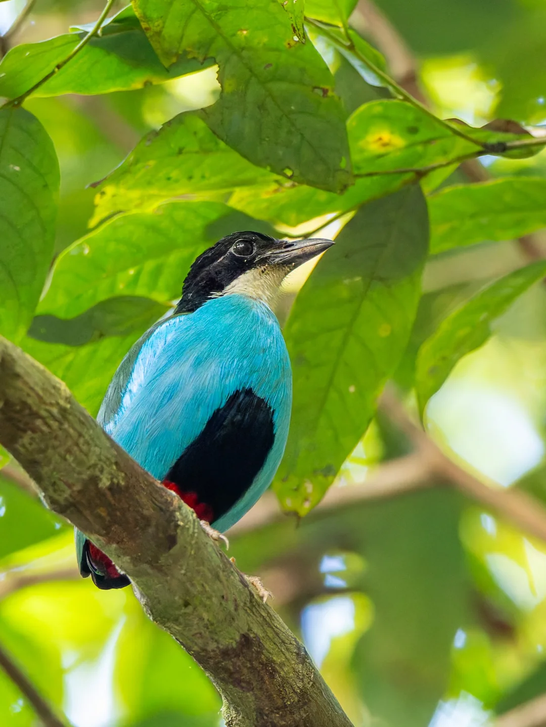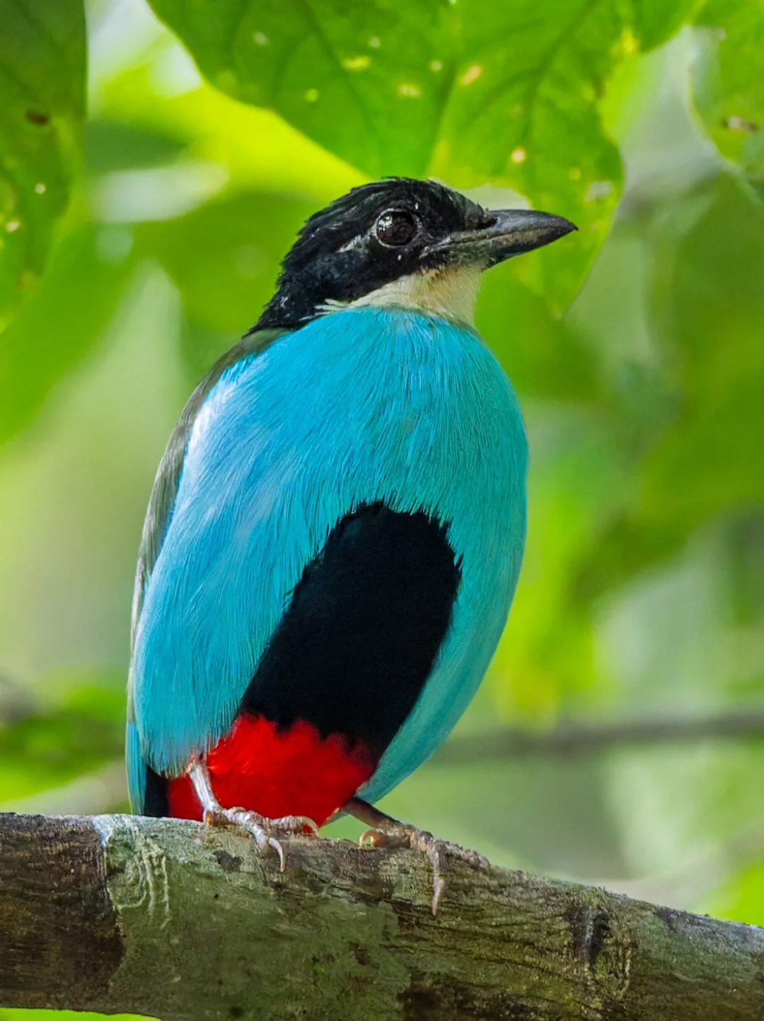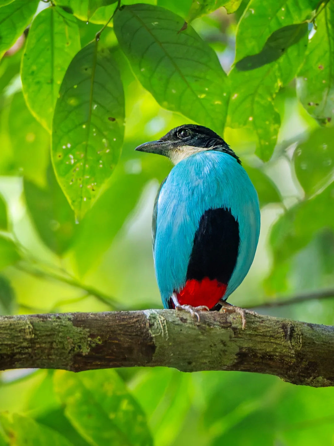 原创拍摄于2026.03 蓝胸八色鸫,Azure-breasted Pitta,雀形目八色鸫科八色鸫属。仅分布于菲律宾的棉兰老岛和中东米沙鄢诸个岛屿的热带雨林中。 蓝胸八色鸫胸部的蓝像是绿松石的蓝,Tiffany蓝,蓝的时尚。再加上腹部中央黑色,下部鲜红色,翅膀绿色的撞色拼接,整个非常高级。 在薄荷岛观鸟,蓝胸八色鸫是鸟单中重要一位,在地面生活的八色鸫本身就有较大难度,还好遇到了这只给面子的小鸟,飞上来我们头顶的枝头,待了十来分钟啊。