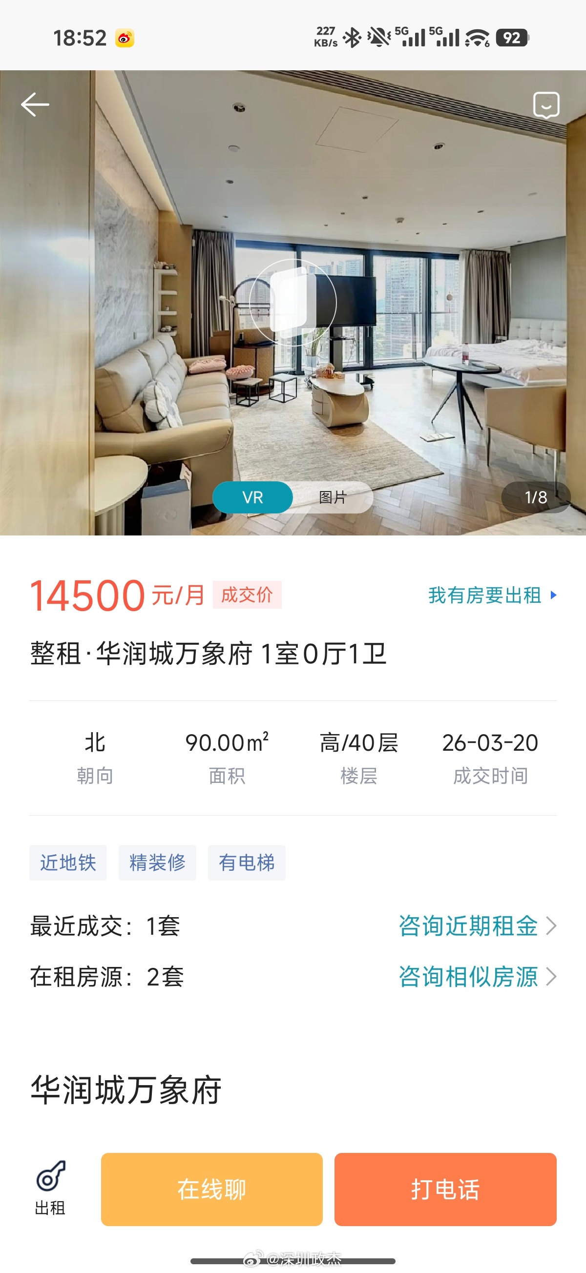 深圳南山万象天地楼上的万象府,90平1房1厅1卫,租金1.5万/月,有不少小姐姐