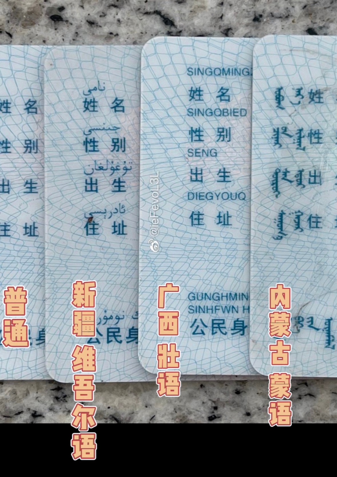 原来身份证不是全国统一的不搜不知道,一搜才发现原来中国有六个少数民族拥有与汉字并列的双文版身份证啊,包括壮族,维吾尔族,彝族,藏族,蒙古族和朝鲜族,看似是拼音的那版,其实是壮文又一个冷知识,其实身份证最后一位不是 x,而是罗马数字中的10又是涨知识的一天…