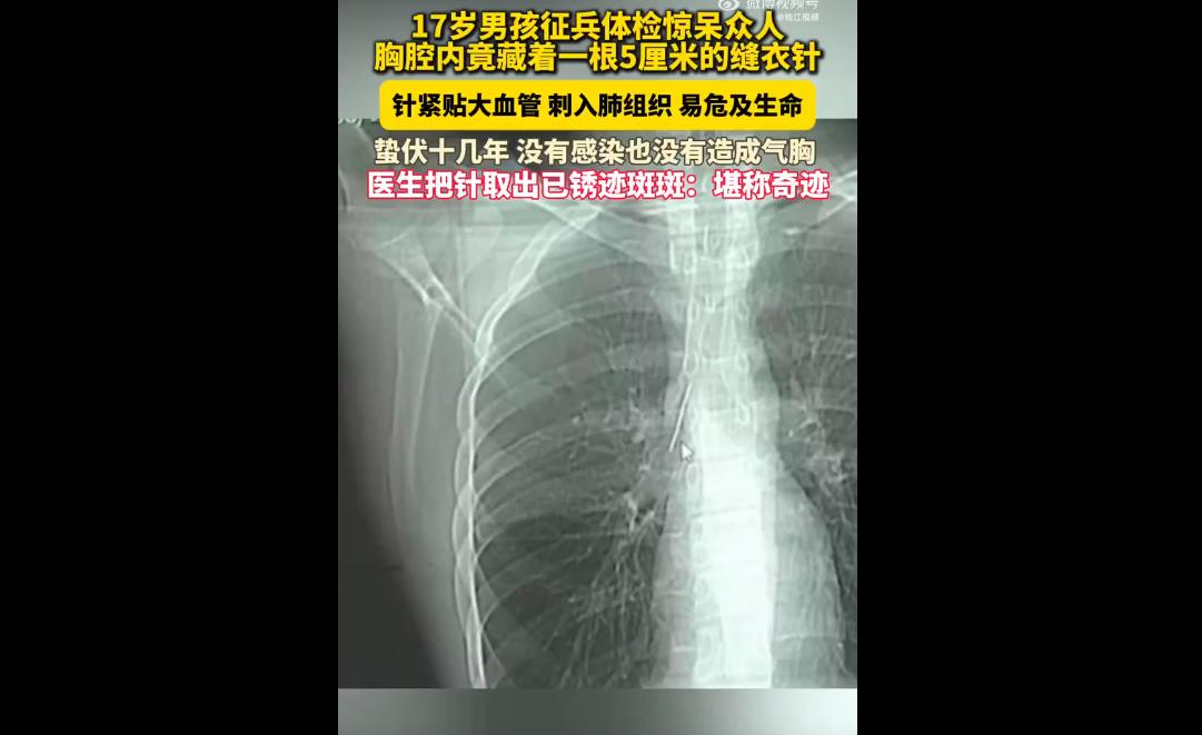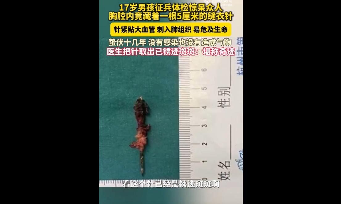 17 岁小伙小陆参加参军体检时,意外发现胸腔内藏有一枚 5 厘米长的缝衣针。针已滞留体内十余年,紧邻大血管,位置凶险却未引发不适。 医生推测为其幼时不慎扎入,现已通过微创手术成功取出。医生提醒,体内异物易游走致严重伤害,发现异常应及时就医。 我们很难想象,一枚尖锐的金属针在胸腔内静静停留十几年,紧邻大血管,随时可能刺破血管危及生命,而少年却毫无痛感、浑然不觉。 这既得益于身体组织的包裹保护,也离不开极大的幸运。倘若没有这次征兵体检,这颗 “定时炸弹” 不知何时会被触发,后果不堪设想。 少年的军旅梦险些因此受阻,也让我们看到,一次常规体检,有时就是守护生命的关键防线。 这件事也折射出幼儿看护中的细微隐患。 孩子一岁多时曾莫名哭闹,家长因孩子年幼无法表达而未深究,如今回想起来,正是那次意外埋下了隐患。 幼儿好奇心强、表达能力弱,对细小尖锐物品缺乏安全认知,极易发生误食、扎入等意外,而家长往往难以第一时间察觉,给健康留下长久风险。 医生的提醒尤为重要:体内异物不会一直 “安分”,可能随身体活动游走,腐蚀组织、引发感染甚至大出血。 很多看似不起眼的小意外,都可能在多年后爆发严重问题。 因此,无论成人还是孩子,出现不明原因疼痛、发热等症状,都应及时检查,切勿抱有侥幸心理。