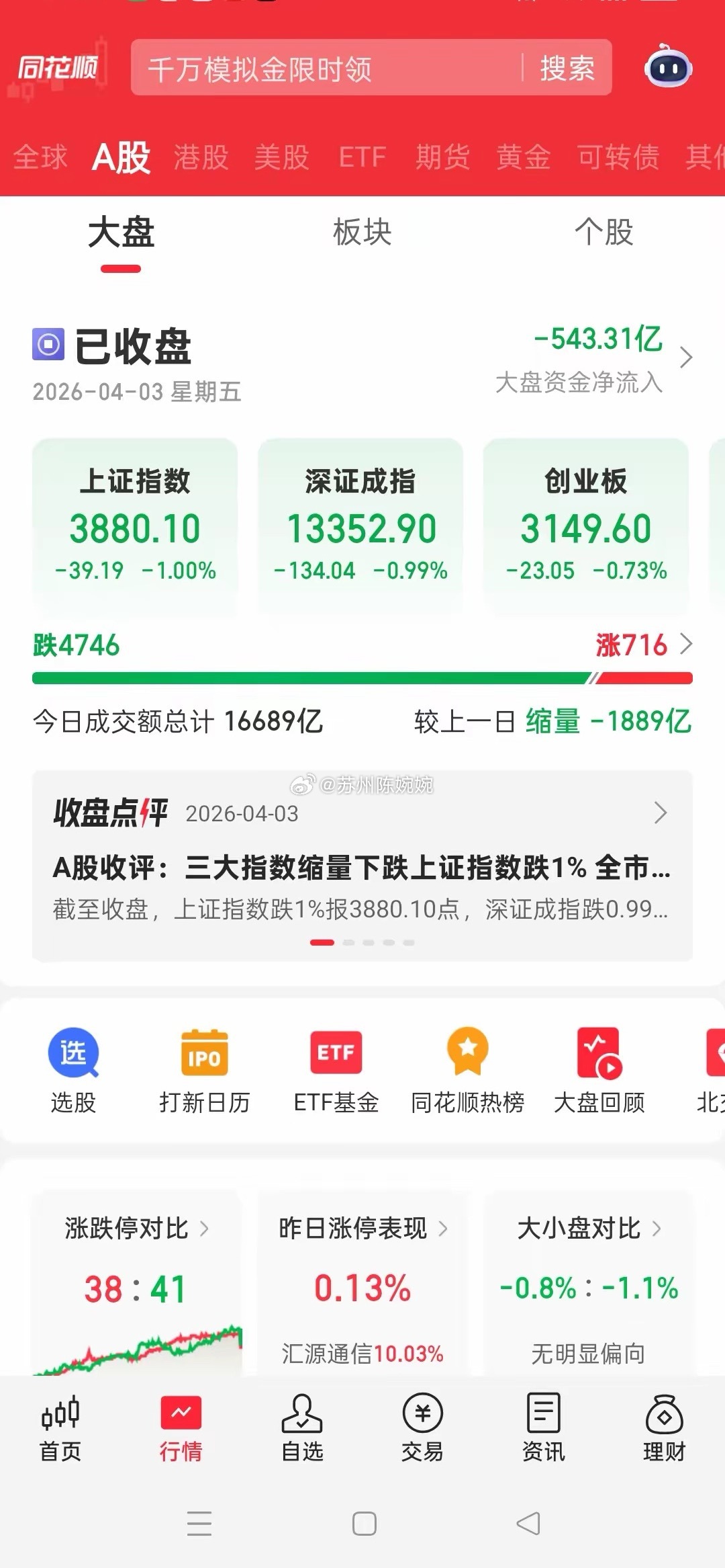 今日没有了北向资金的压轴,A股谁在砸盘?大家这下应该一目了然了。天天相同的套路,大A这市场已沦落到成为量化的屠宰场。目前的市场真的已经不适合散户生存了,量化加融券做空再加上他们T+0的VlP交易通道,可以分秒之间将散户剿杀的溃不成军。大A今天低开低走,差一点跌破3870了,今日这市场这走势,究竟又会让谁来背锅?说实话,这口大锅,散户可是背不起又背不动哟!自2月底美伊开战以来,A股中的大部分人个人账户是亏损严重的,并且大多数人已对A股的未来充满了恐惧感,怕的是市场一旦造成羊群踩踏效应,以后的市场将失去大批的接盘侠了。市场热点涣散,没一个板块能起到凝聚作用,就连油气板块虽然期货大涨,股价依旧难逃下跌的宿命,其他板块多半都是半日游或一日游行情,这一切的一切根源还是与量化息息相关。大家都选择了躺平,这也是成交量日渐萎缩的原因所在,相信大家也许都在等4月7号的量化新规出台后的市场表现了,如果新政策依旧是偏向于机构量化一方,也许有一部分散户会与市场说拜拜了。跌就是跌了,勿须甩锅于清明节日效应,毕竟只有下周一1个交易日休市,强行甩锅也不现实。清明时节雨纷纷,亿万股民人欲断魂。
