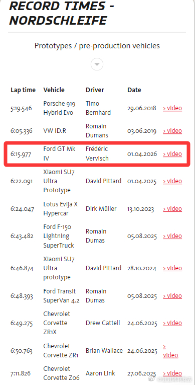 纽北最速纯内燃机驱动车型! 🏆 最速美国车! 🥉 纽北原型车圈速榜第3! 🥉 纽北总圈速榜第3!🏎️车辆: Ford GT Mk IV👨车手: Frédéric Vervisch⏱️圈速: 06:15.977🏁赛道: Nürburgring-Nordschleife 纽博格林北环 📊长度: 20.832公里完整🏅类别: 原型车/预量产车型🛞用了米其林还在保密阶段得pilot sport热熔胎
