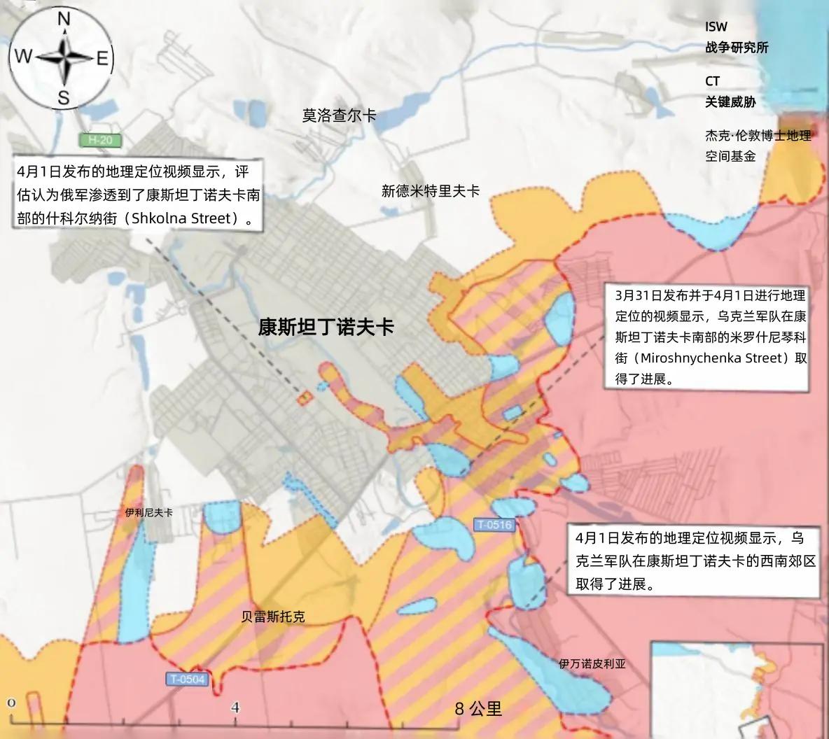 决战双子城之外围争夺:乌军在多点位反击推进 4月1日发布的地理定位视频显示,乌军在利曼以北的斯塔夫基东南方向发起反击并成功推进,同时在斯拉维扬斯克以东的里兹尼基夫卡以北区域突破俄军前沿防线,巩固了该方向的防御支点,有效遏制俄军向斯拉维扬斯克城区侧翼包抄的企图。 3月31日地理定位视频显示,俄军对康斯坦丁诺夫卡城区及西南郊区实施密集火力打击,证实乌军已在上述区域完成推进,将战线前推至俄军预设阵地前沿。 同日,俄第3合成集团军(原“卢甘斯克人民共和国”第2军)第4独立摩步旅FPV无人机机组,在康斯坦丁诺夫卡以南伊万诺皮利亚中心区域打击乌军占据的建筑,明确印证乌军已收复该区域核心地带,突破了俄军外围防线。 4月1日,俄军向康斯坦丁诺夫卡南部实施小分队渗透,但未成功。 (本文部分参考战争研究报告)