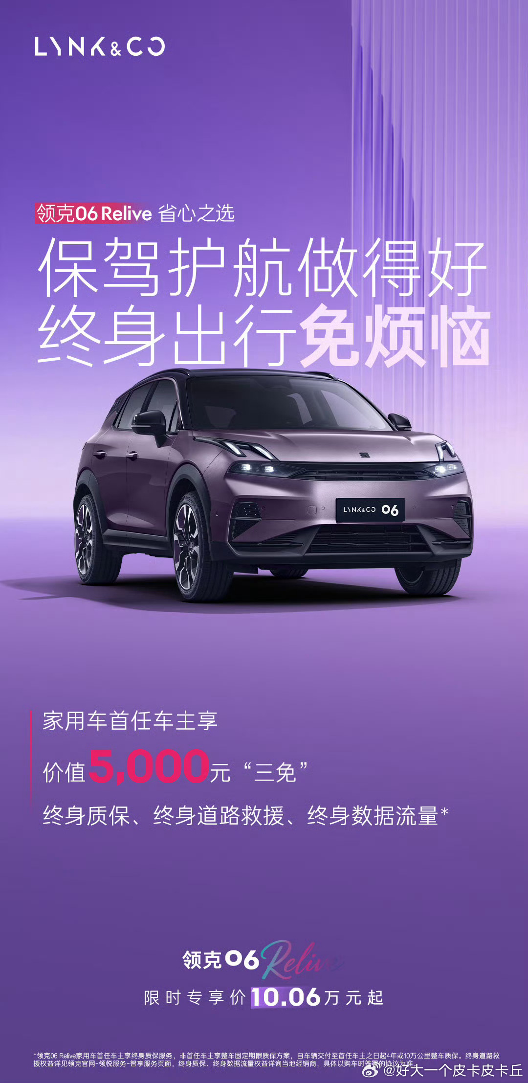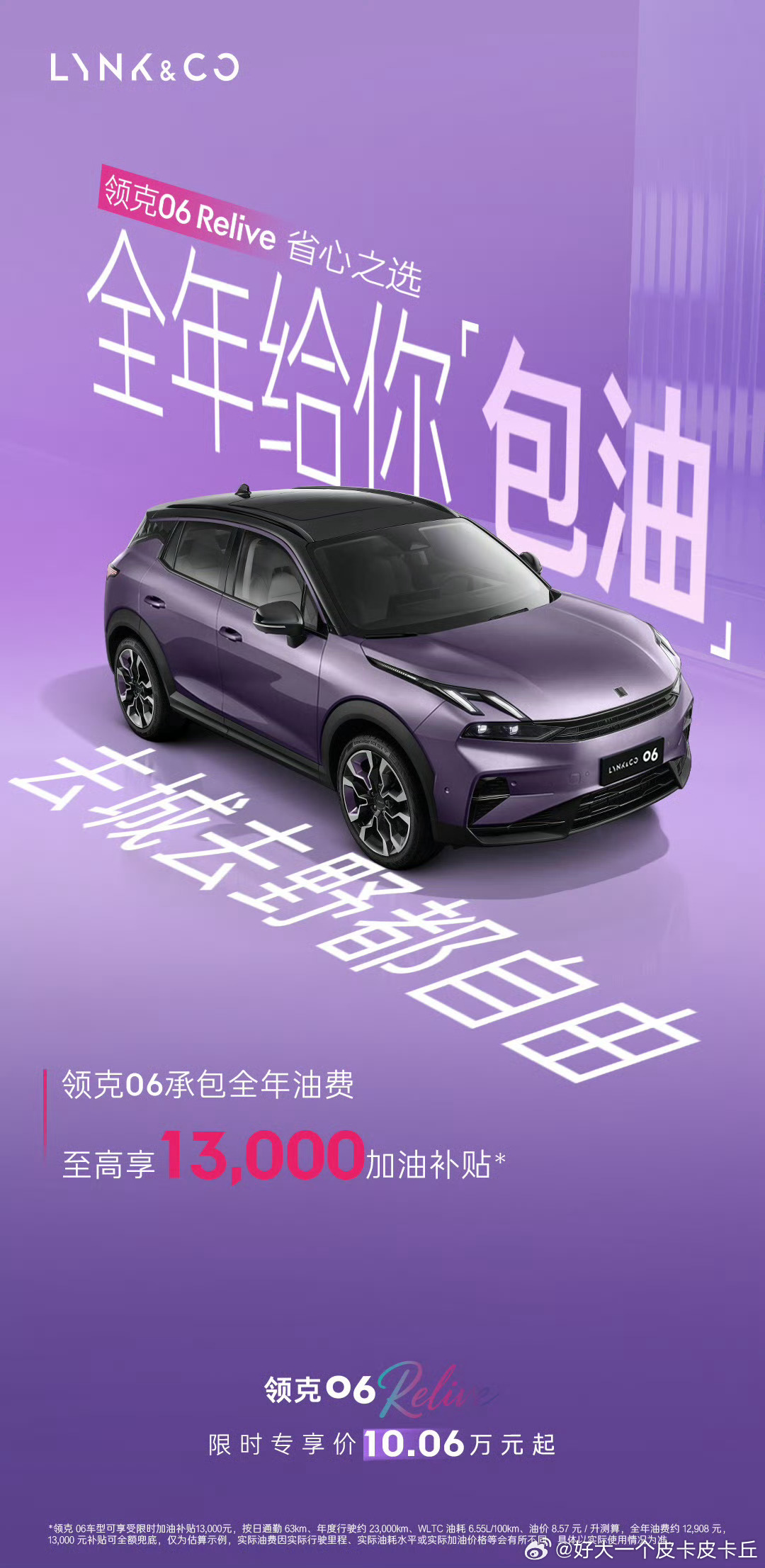 领克06 Relive把价格压到10万出头,还包全年油费,这在10万级SUV里极具杀伤力 。它不只是卖车,更是卖一种“无负担”的精致感,精准切中了年轻人既想要高颜值、又在意养车成本的痛点 。