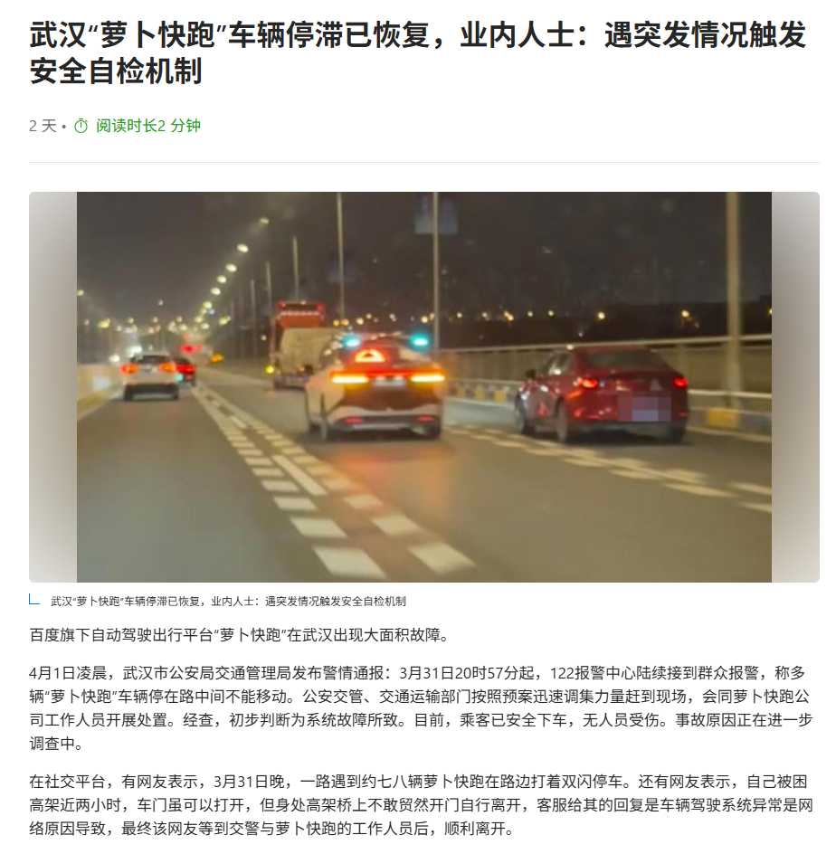 3月31日晚,武汉市区部分“萝卜快跑”车辆发生短暂停滞,近期很难打到萝卜快跑的无人车了。但武汉市民及外地游客纷纷对萝卜还挺想念的,希望它能尽快恢复正常接单。