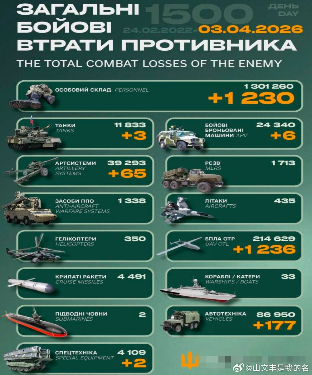 乌俄战争进入第1450天,乌克兰总参谋部发布战报:过去24小时乌俄双方交战98次,其中20次在胡利亚伊波列(16次在苏梅)、18次在康斯坦丁诺夫卡、6次在利曼、31次在波克罗夫斯克、7次在南顿涅茨克区域。毙伤俄1230名。俄军累计损失1301260人。摧毁俄3辆坦克、6辆装甲车、65门火炮、1236架大型无人机、177辆军车、2件特种设备。