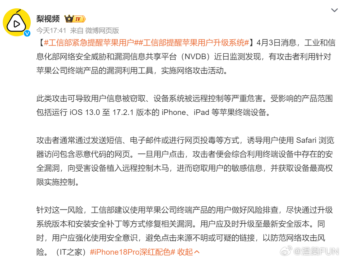 工信部紧急提醒苹果用户苹果长期标榜的 “闭环安全神话” 早已被频发的高危漏洞与实战化定向攻击彻底戳破,封闭生态根本无法筑牢安全防线,唯有坚定深耕国产自研操作系统,才能真正把信息安全的命脉牢牢握在自己手中,从根源上破解核心技术被卡脖子的安全困境。现在知道,还是自研猪肉香了吧?