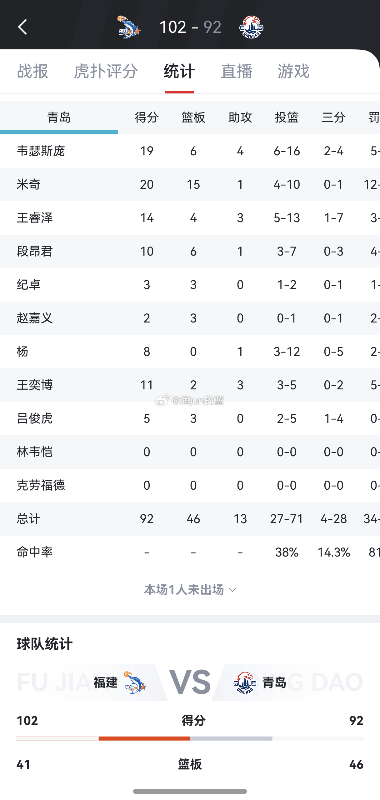 青岛客场对福建的比赛因为场馆漏雨打的一波三折,两次被迫暂停比赛清理雨水,让球员状态无法一直保持在最佳,最终青岛输给对手,本赛季面对福建1胜2负。(我不太明白,上赛季青岛队战绩比福建好那么多,为什么本赛季两支球队的3场对决里,安排的是福建2个主场,青岛1个主场,这公平吗?这是联盟在故意照顾成绩更差的球队吗?)