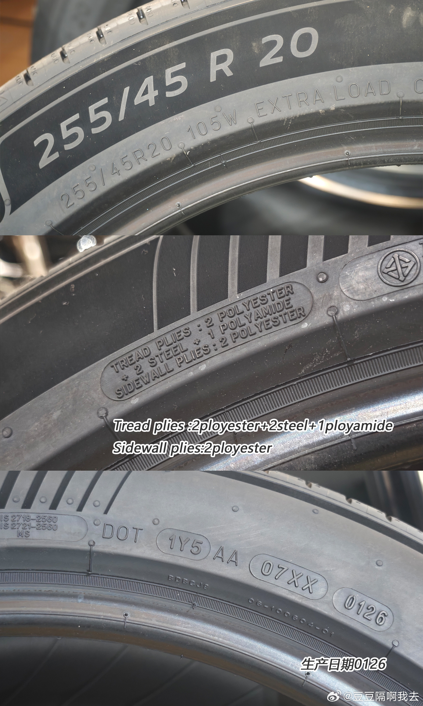 图2 图3耐磨 Treadwear440;牵引力 Traction A,温度等级Temperature A。胎面(Tread plies):2ployester+2steel+1ployamide~2层涤纶+2层钢丝+1层尼龙胎壁(Sidewall):2 ployester~2层涤纶——轮胎外观:Michelin在4代产品开始使用的天鹅绒侧壁是绝对的世界一流观感和触感。鉴于良好市场反馈,从4.5到5代产品开始,在Pilot Sport、Primacy、CC等各产品线,开始使用全绒面胎壁,上车整体高级感和尊贵感满满。