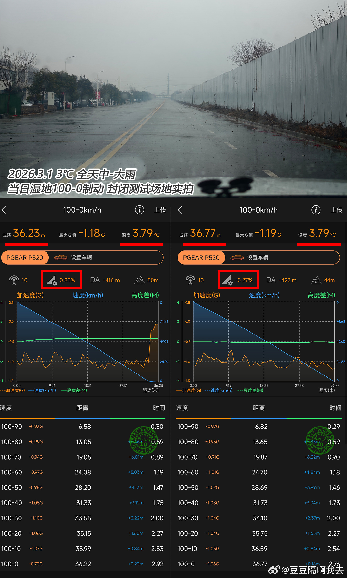 上坡度0.83%,36.23米,下坡度-0.27%,36.77米。湿地刹车距离强的离谱!