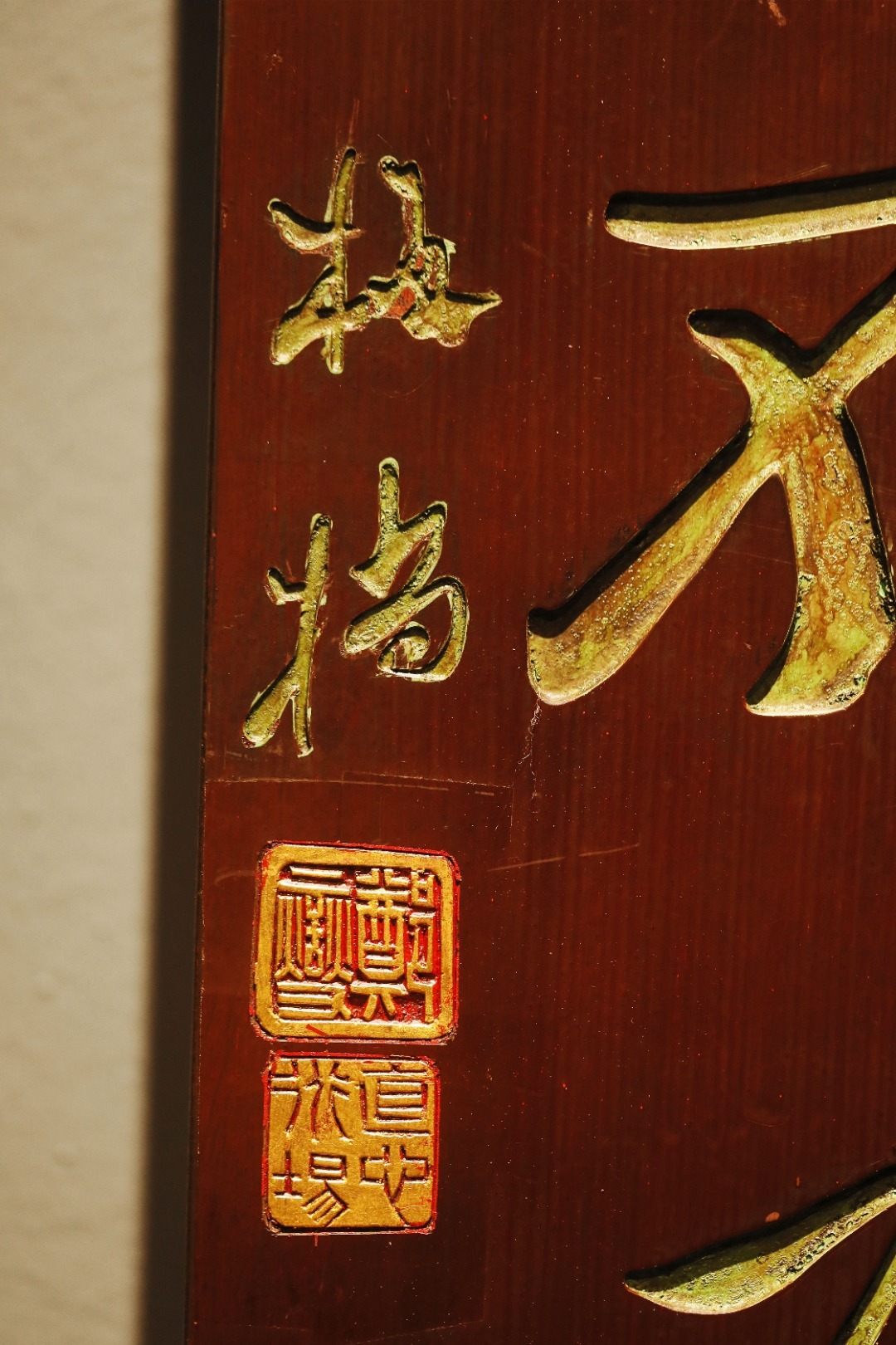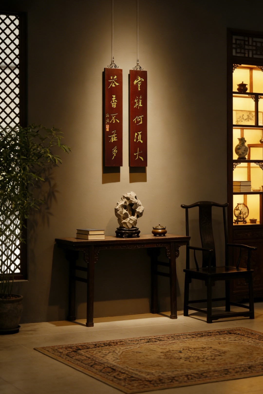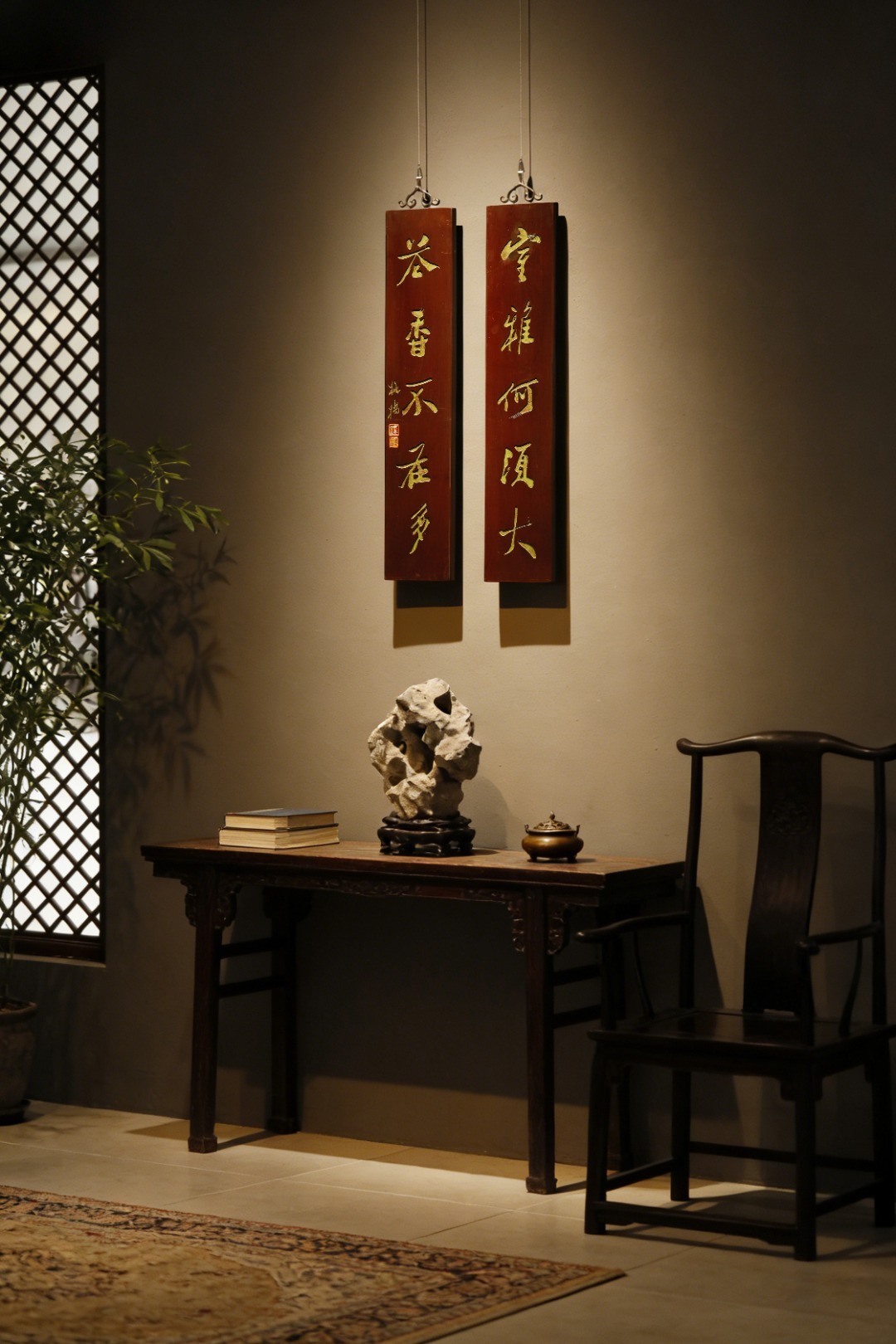 老木板平刻,矿彩漆绘,题识“室雅何须大,茶香不在多”,文人空间,自成一体,茶室造景,古朴典雅。
